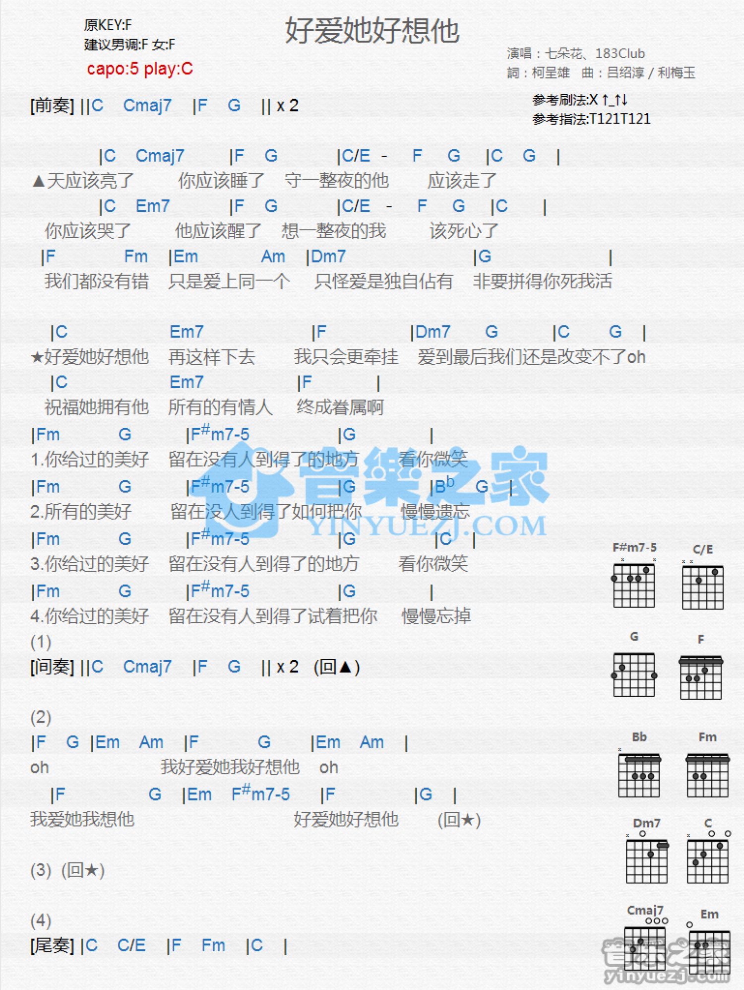 曲谱介绍: C调版 七朵花《好爱她好想他》吉他和弦弹唱谱