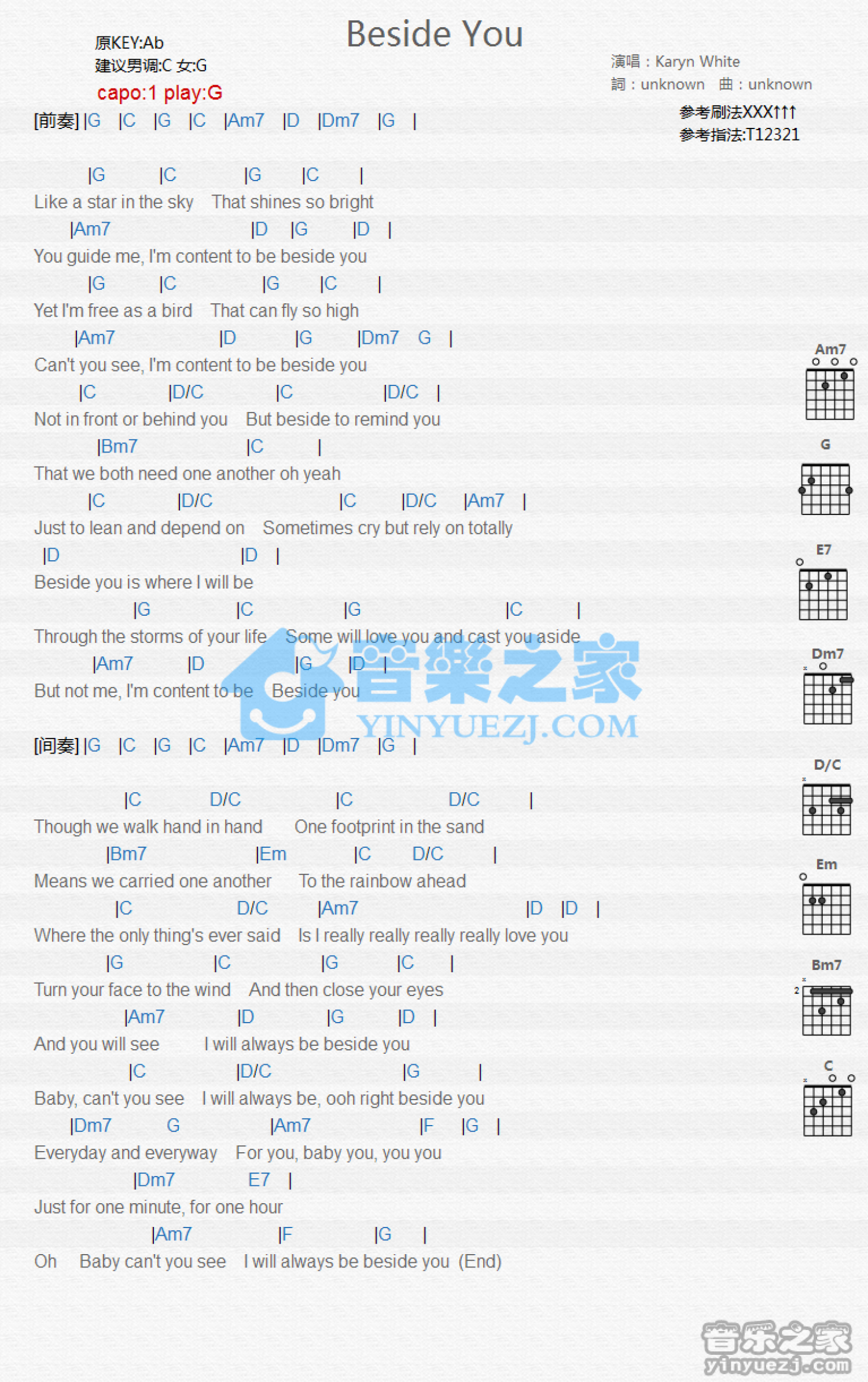 曲谱介绍: G调版 Karyn White《Beside You》吉他和弦弹唱谱