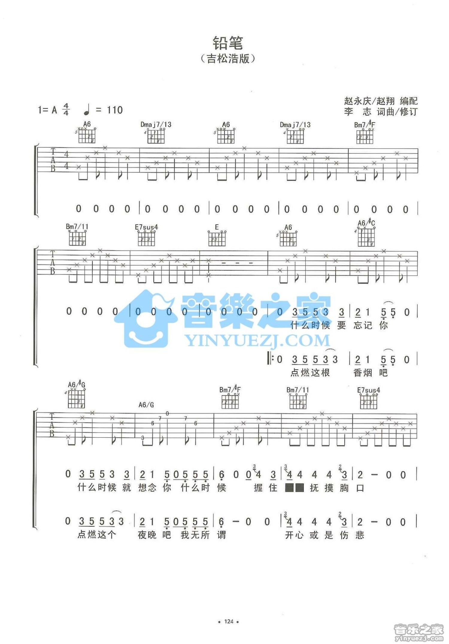 曲谱介绍: A调版 李志《铅笔》吉他弹唱六线谱