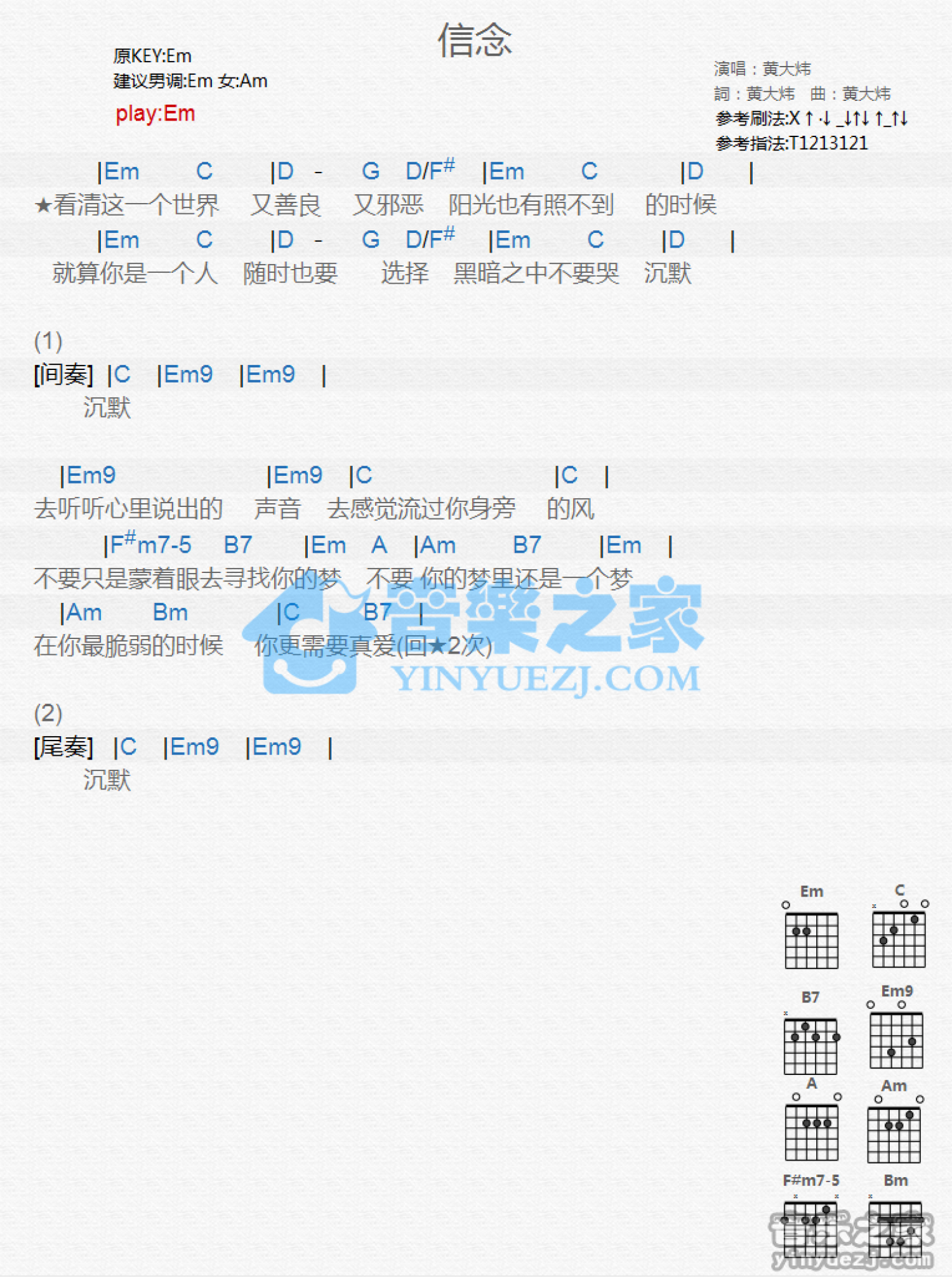 曲谱介绍: Em调版 黄大炜《信念》吉他和弦弹唱谱