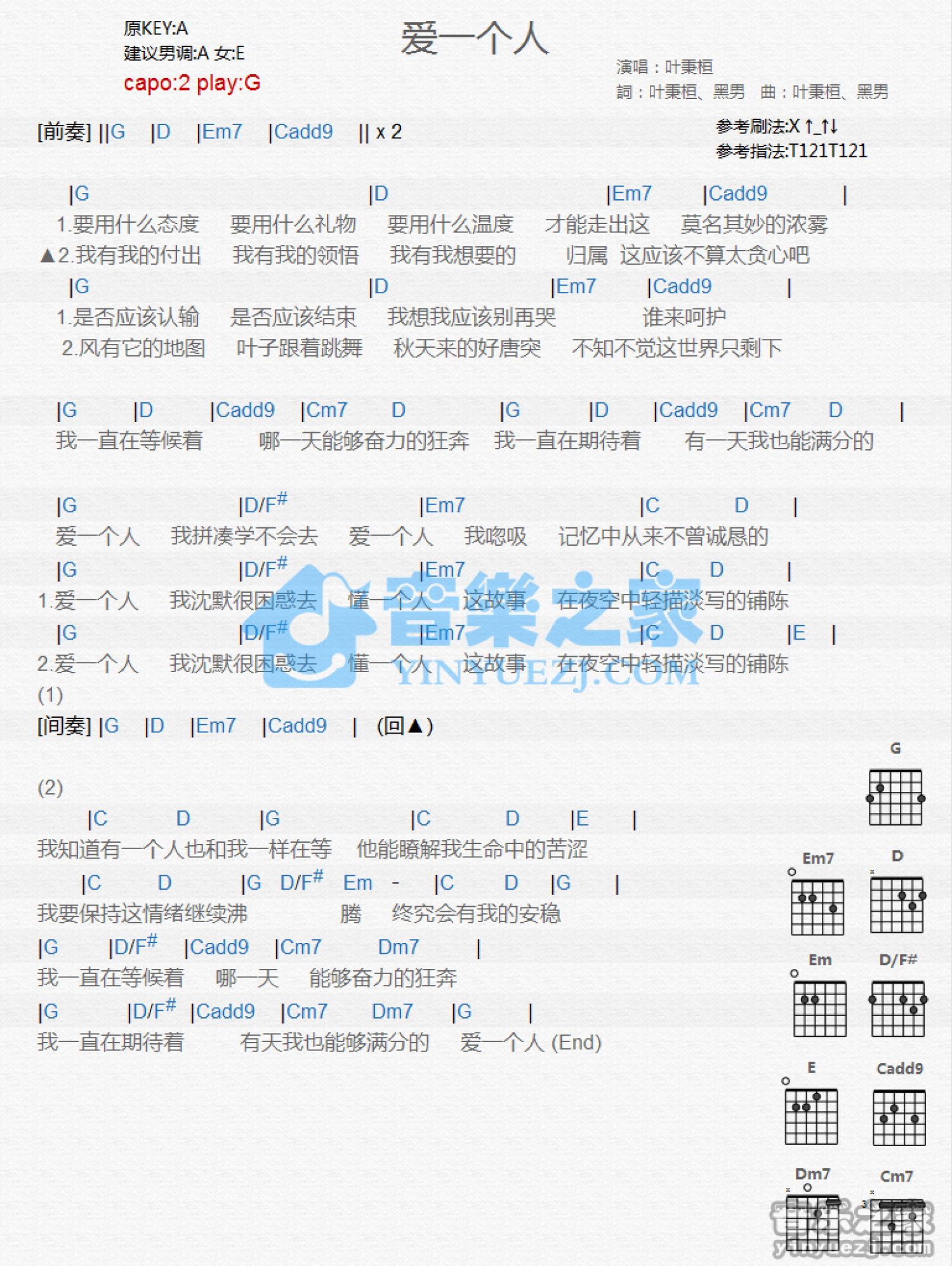 曲谱介绍: G调版 叶秉桓《爱一个人》吉他和弦弹唱谱