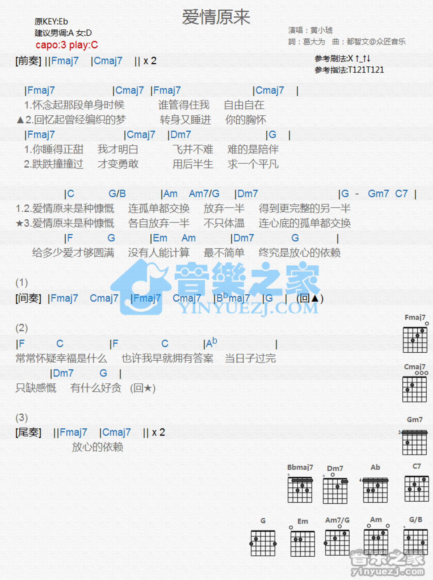 曲谱介绍: C调版 黄小琥《爱情原来》吉他和弦弹唱谱