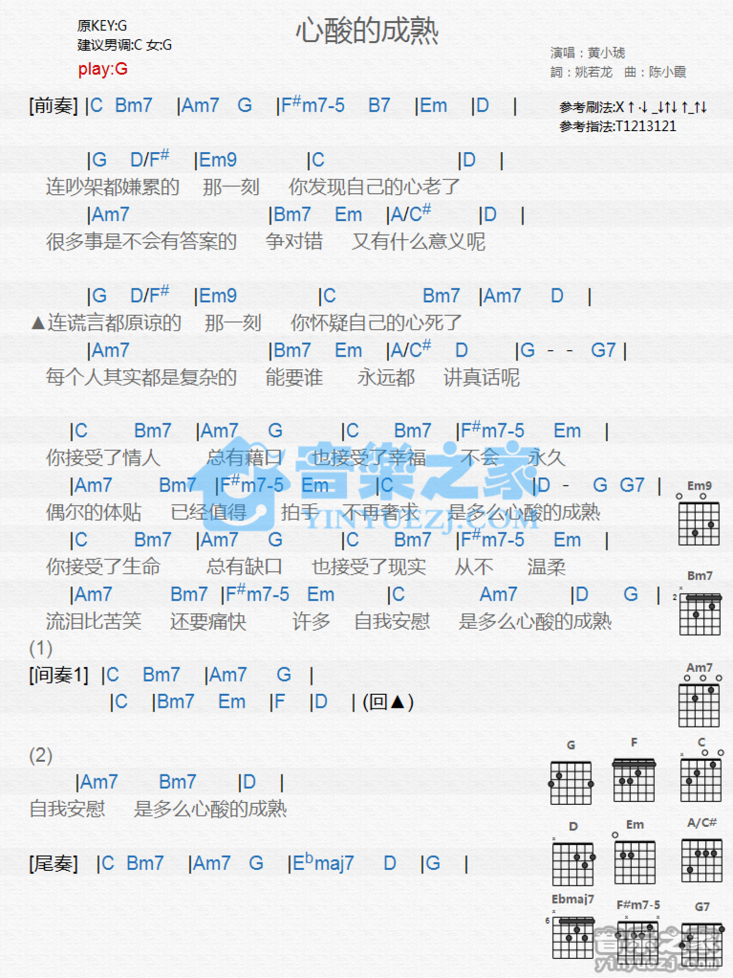 曲谱介绍: G调版《心酸的成熟》吉他和弦弹唱谱