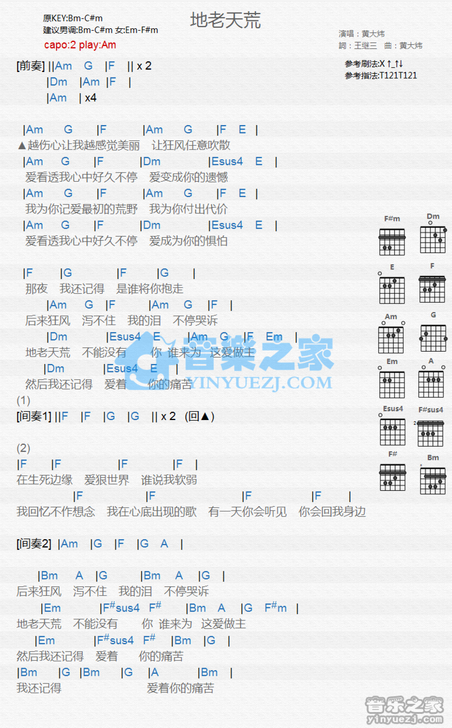 曲谱介绍: Am调版 黄大炜《地老天荒》吉他和弦弹唱谱