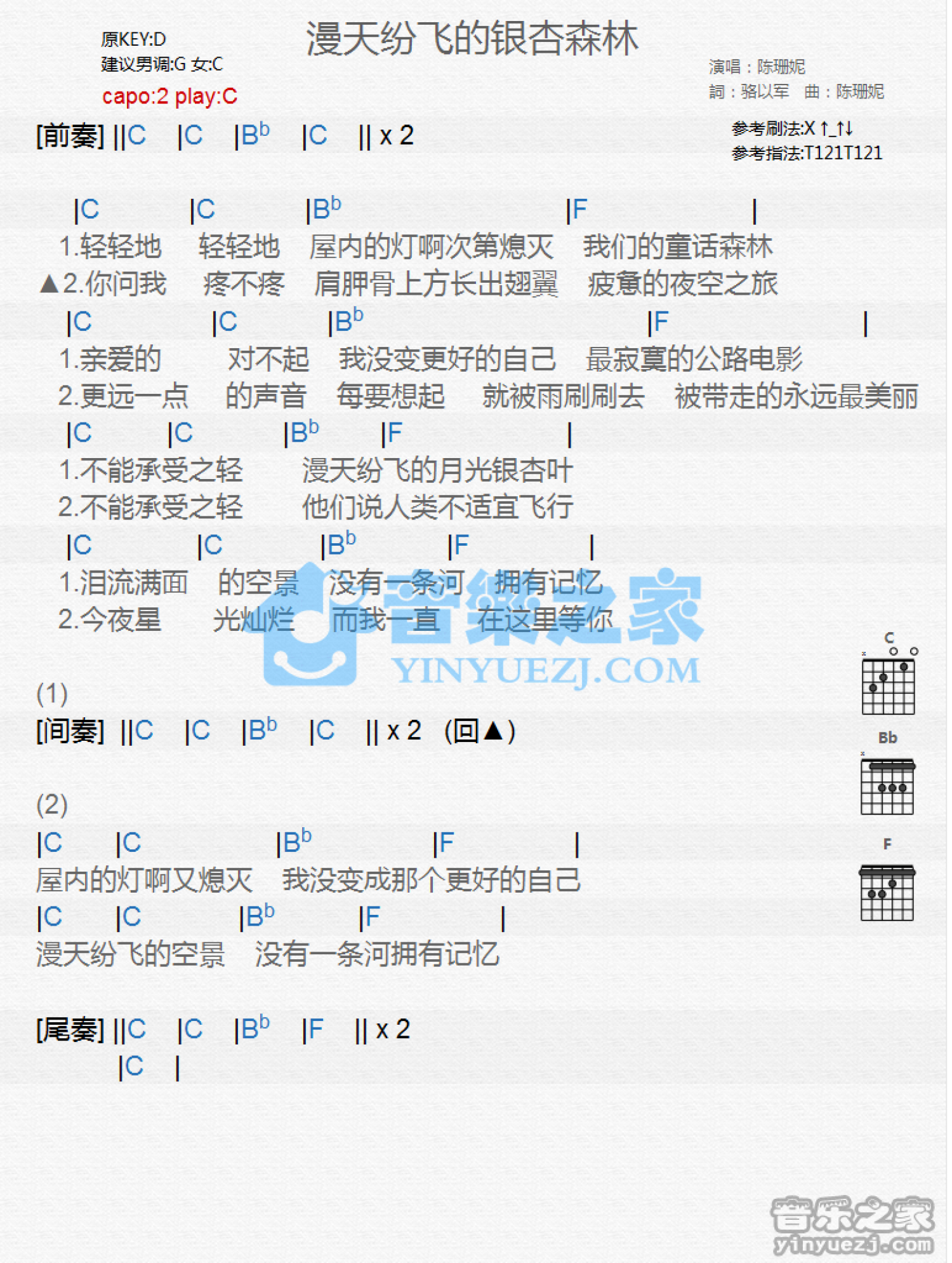 曲谱介绍: C调版 陈珊妮《漫天纷飞的银杏森林》吉他和弦弹唱谱