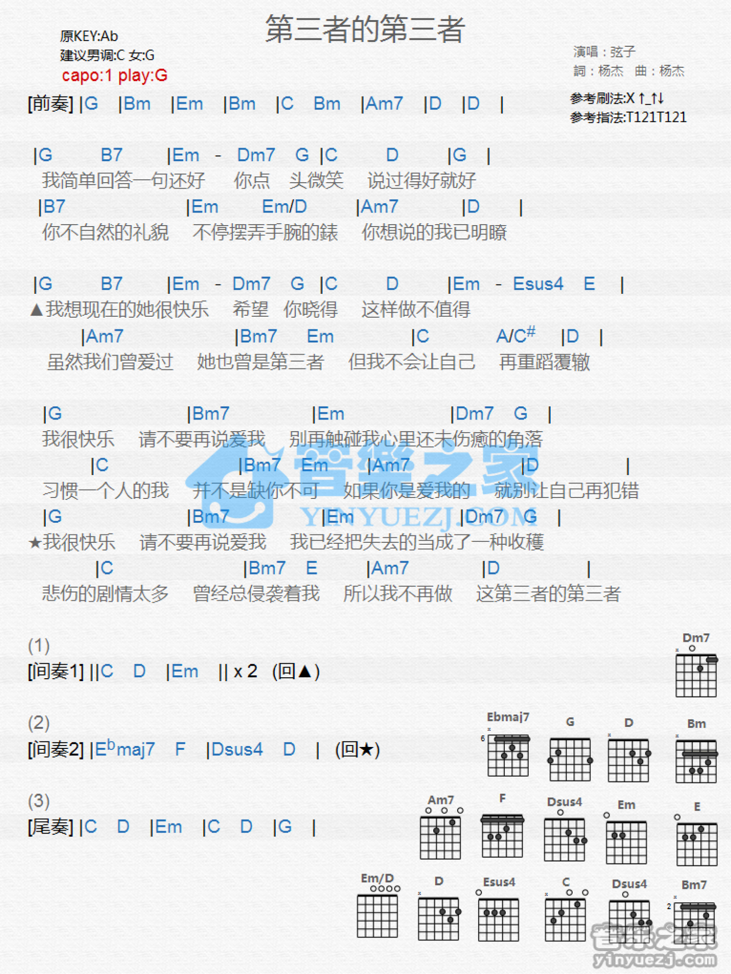 曲谱介绍: G调版 弦子《第三者的第三者》吉他和弦弹唱谱