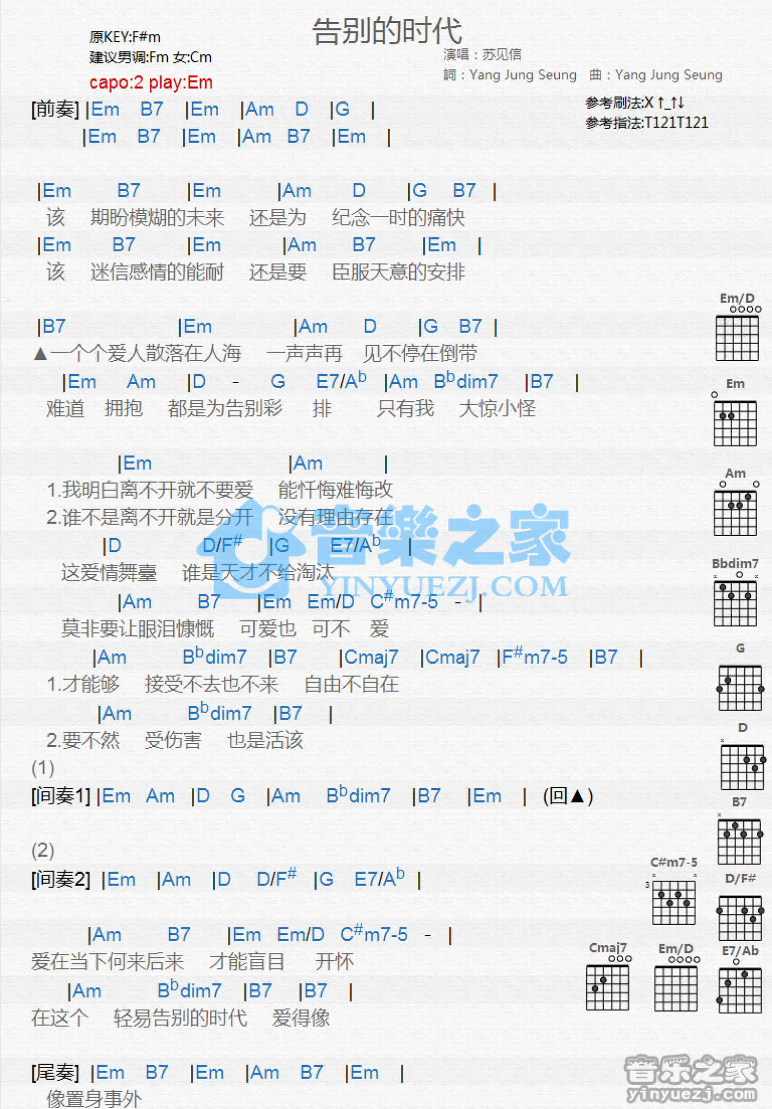 曲谱介绍: Em调版《告别的时代》吉他和弦弹唱谱