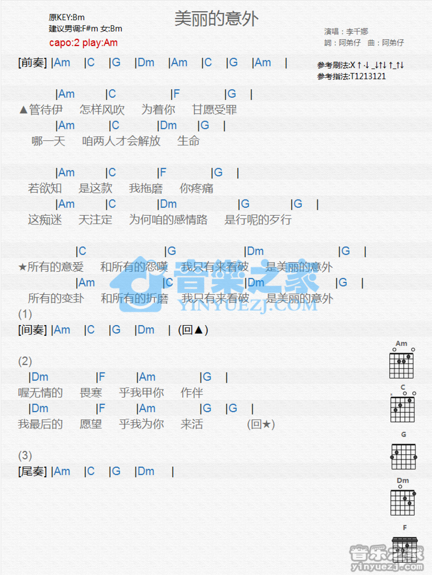 曲谱介绍: Am调版《美丽的意外》吉他和弦弹唱谱