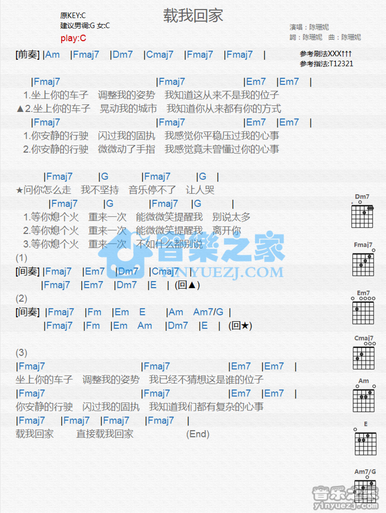曲谱介绍: C调版 陈珊妮《载我回家》吉他和弦弹唱谱