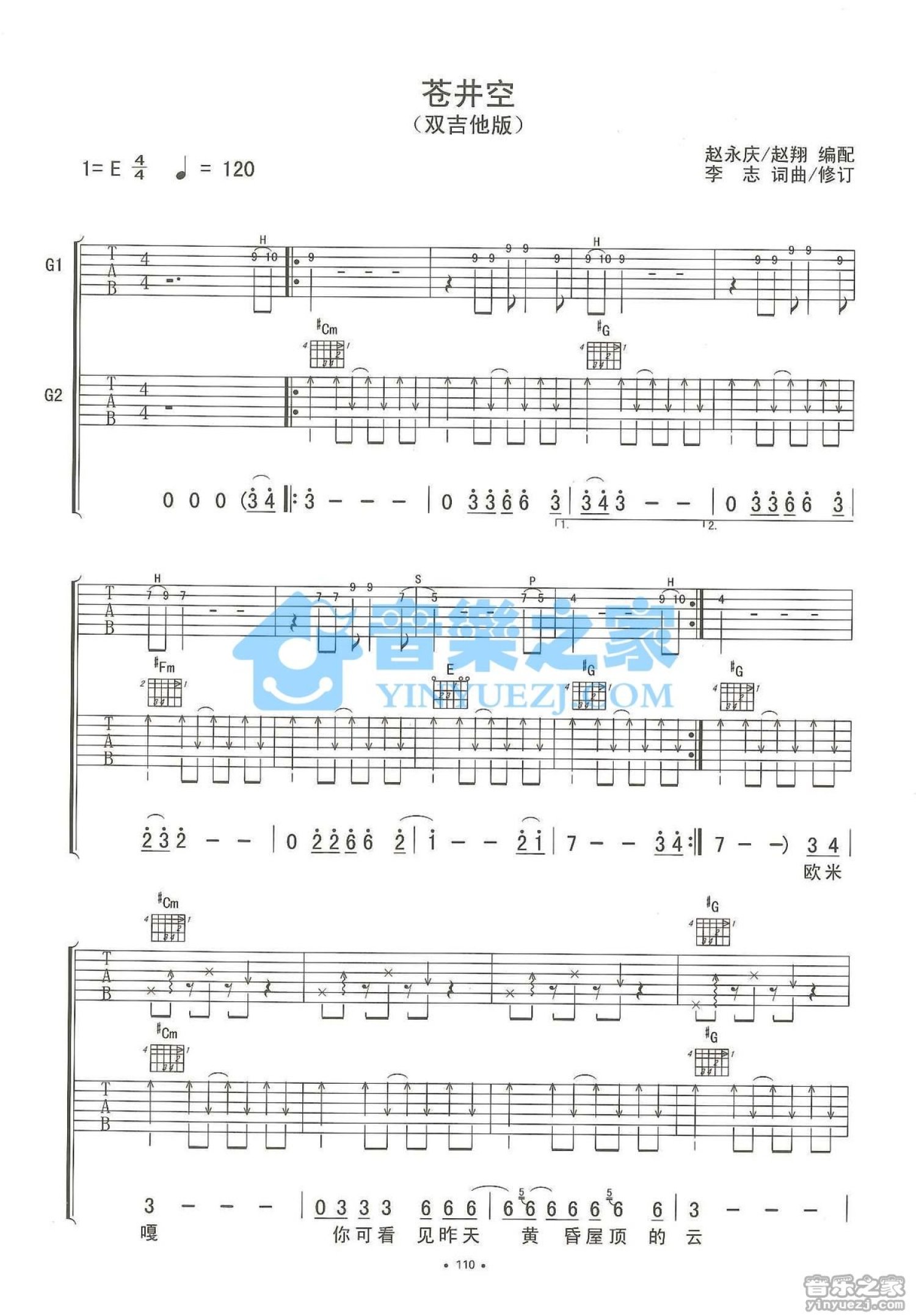 曲谱介绍: E调双吉他版李志《苍井空》吉他弹唱六线谱