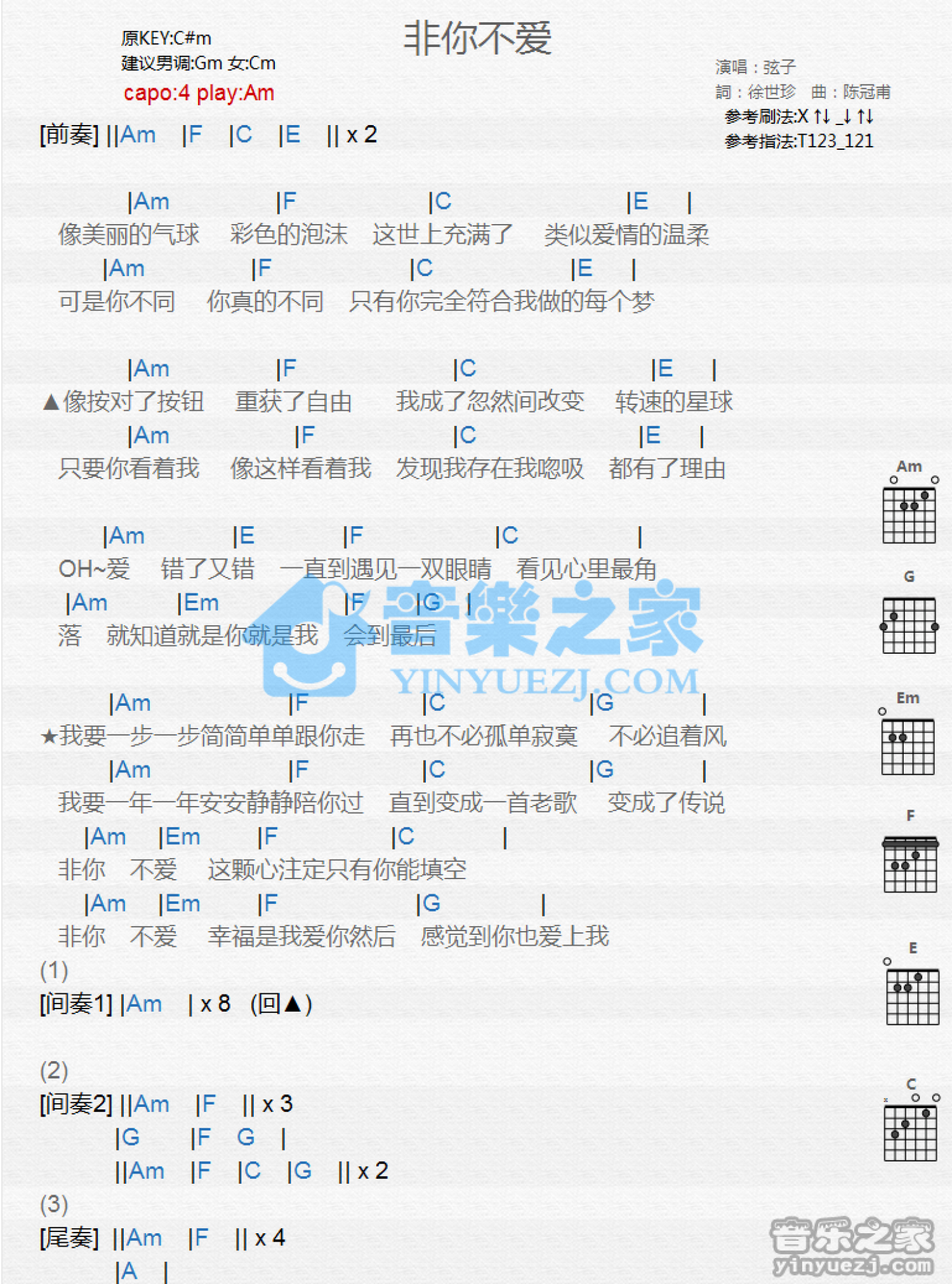 曲谱介绍: Am调版 弦子《非你不爱》吉他和弦弹唱谱