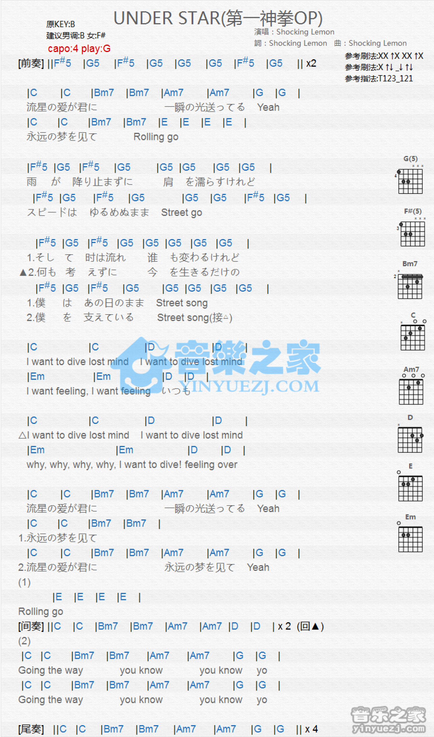 曲谱介绍: G调版 Shocking Lemon《Under Star》吉他和弦弹唱谱