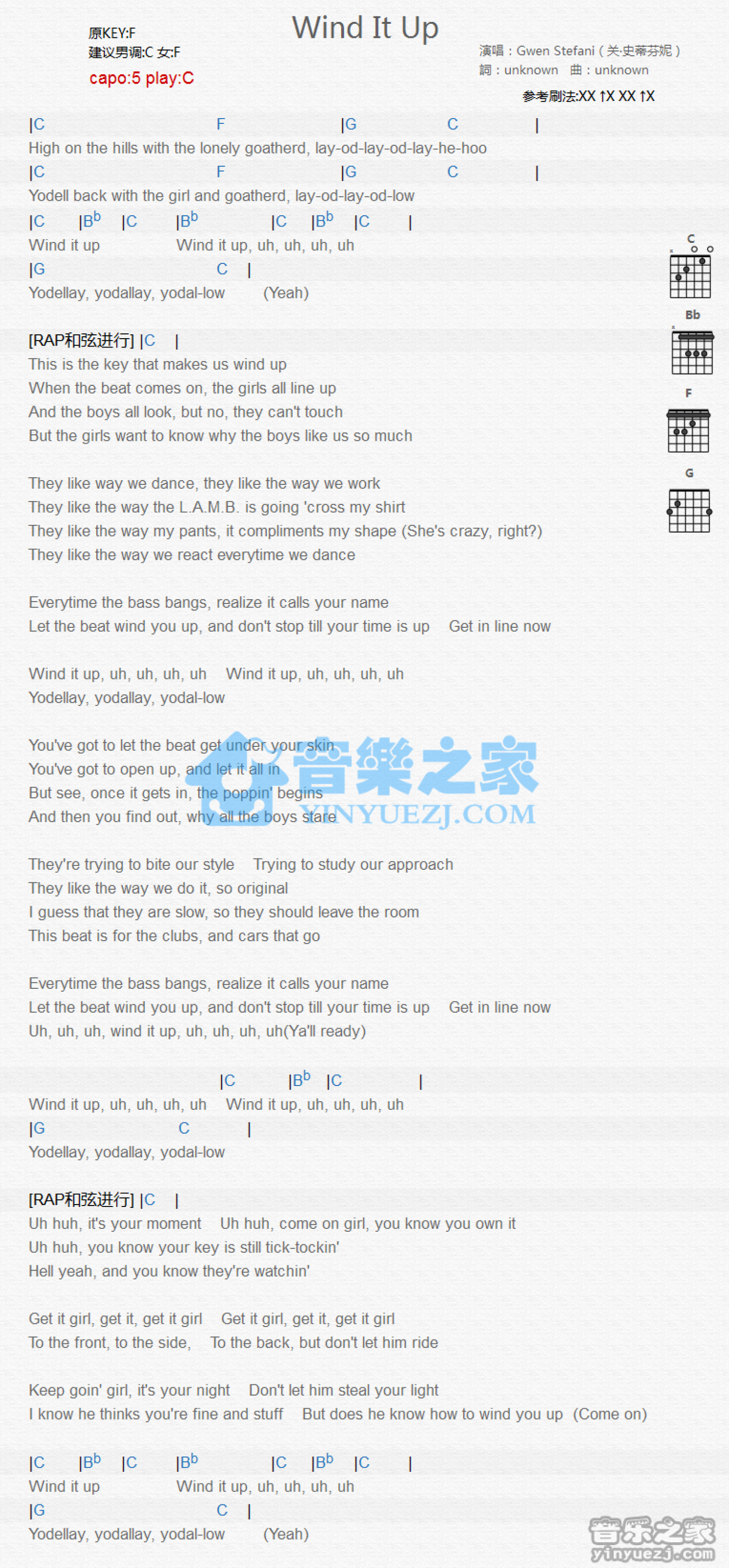 曲谱介绍: C调版 Gwen Stefani《Wind It Up》吉他和弦弹唱谱