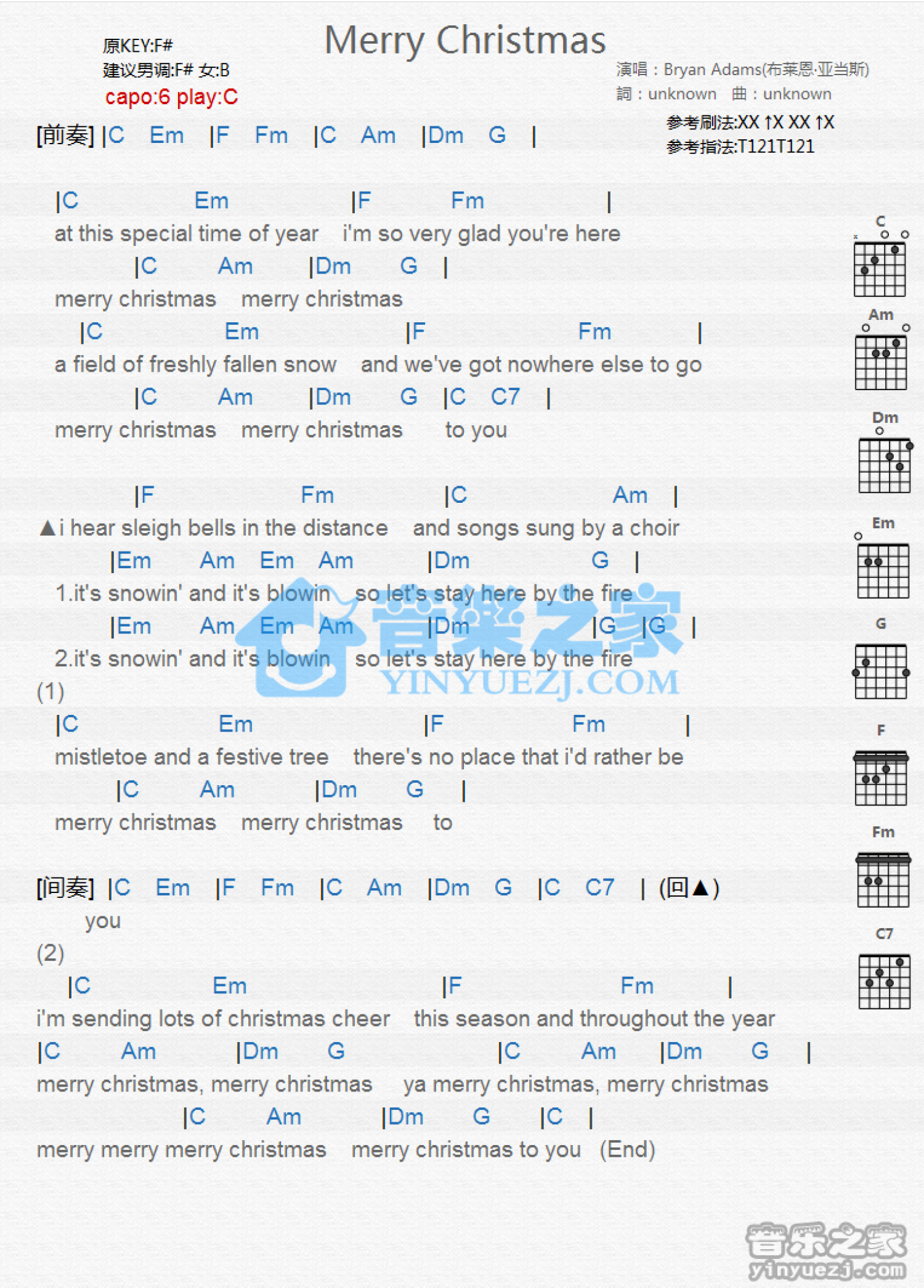 曲谱介绍: C调版 Bryan Adams《Merry Christmas》吉他和弦弹唱谱