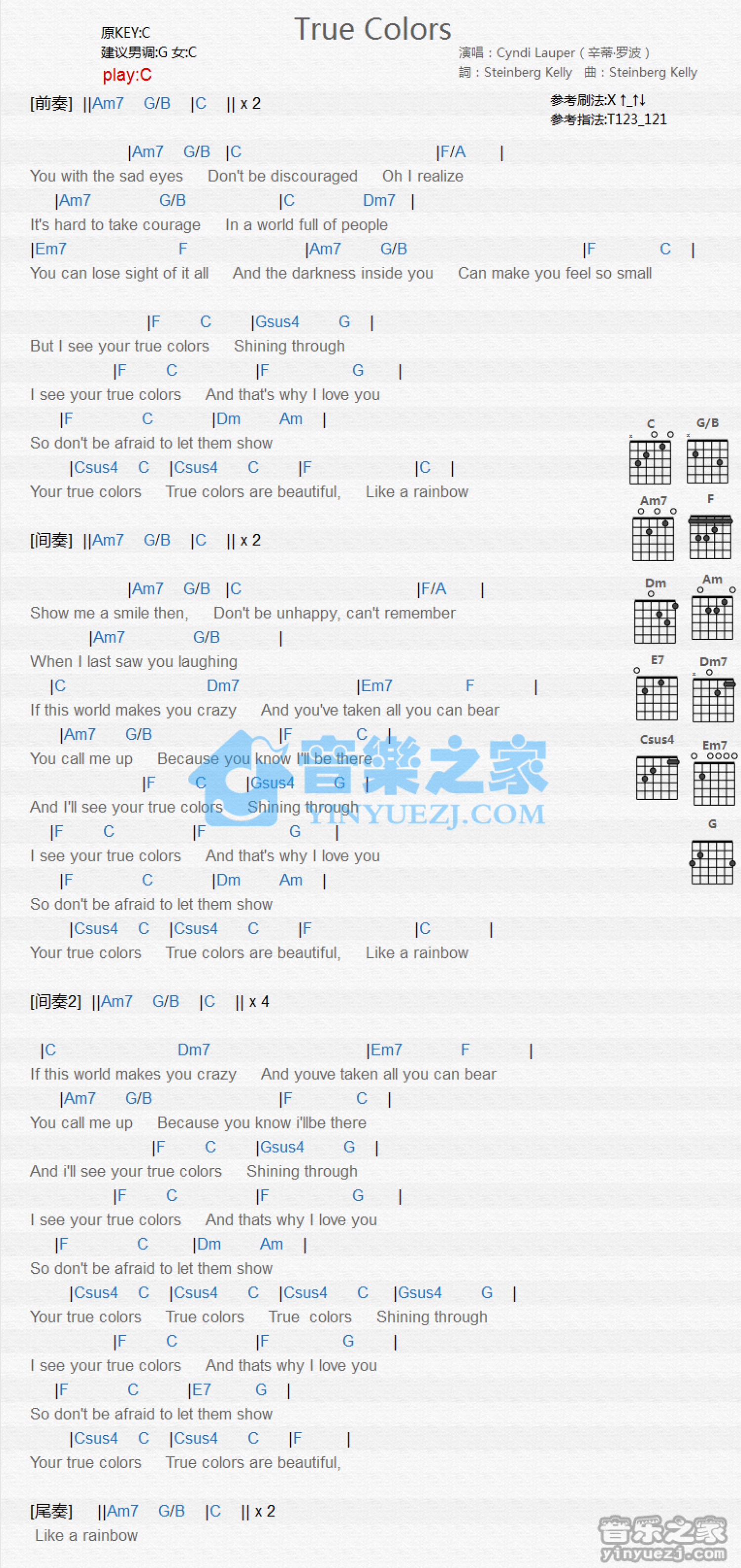 曲谱介绍: C调版 Cyndi Lauper《True Colors》吉他和弦弹唱谱