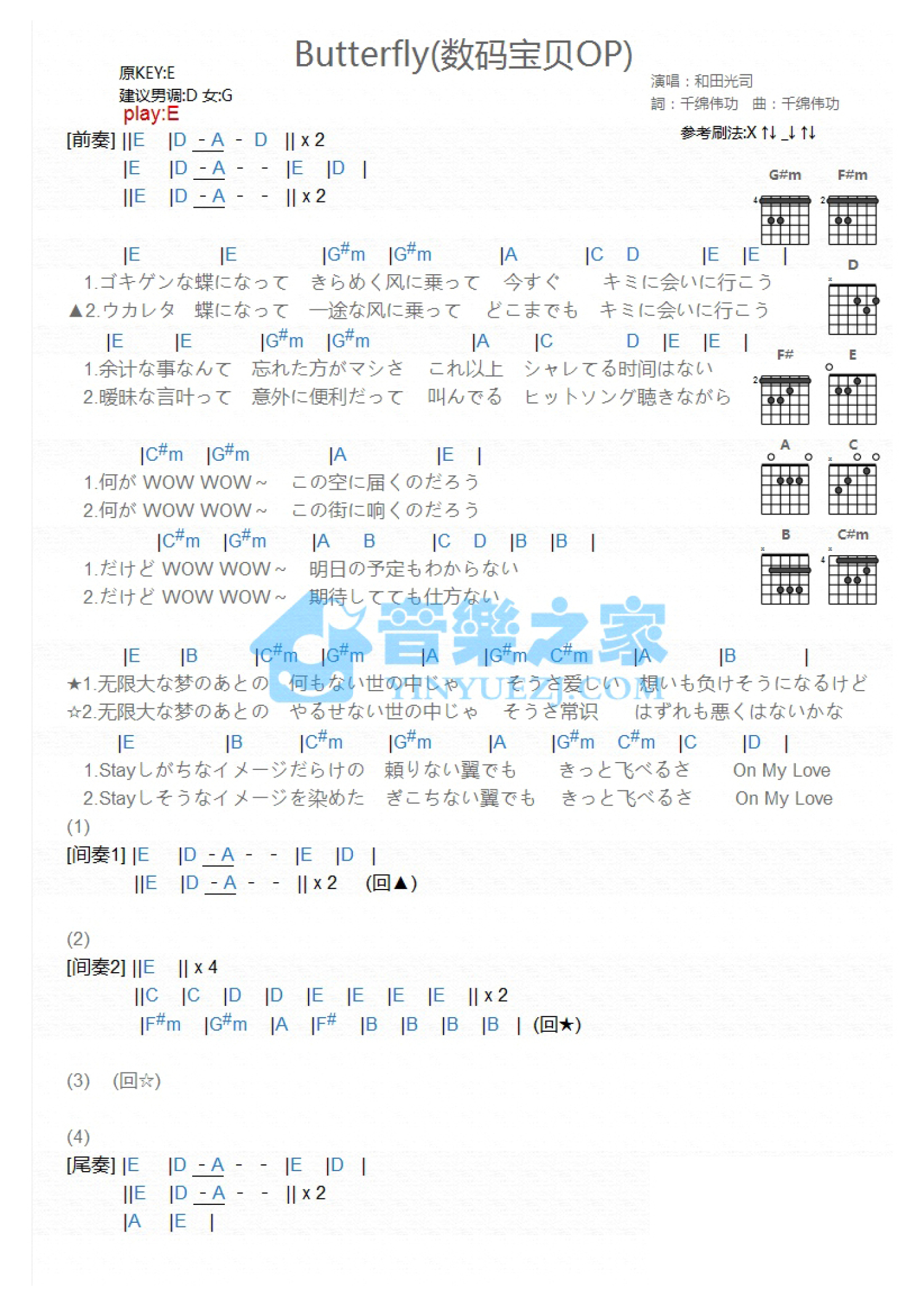 曲谱介绍: E调版《Butterfly》吉他和弦弹唱谱