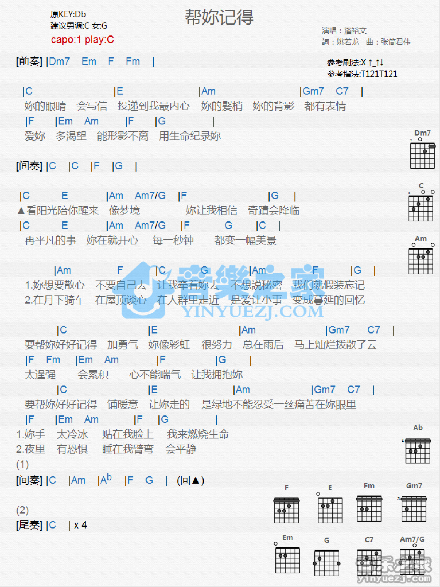 曲谱介绍: C调版 潘裕文《帮你记得》吉他和弦弹唱谱