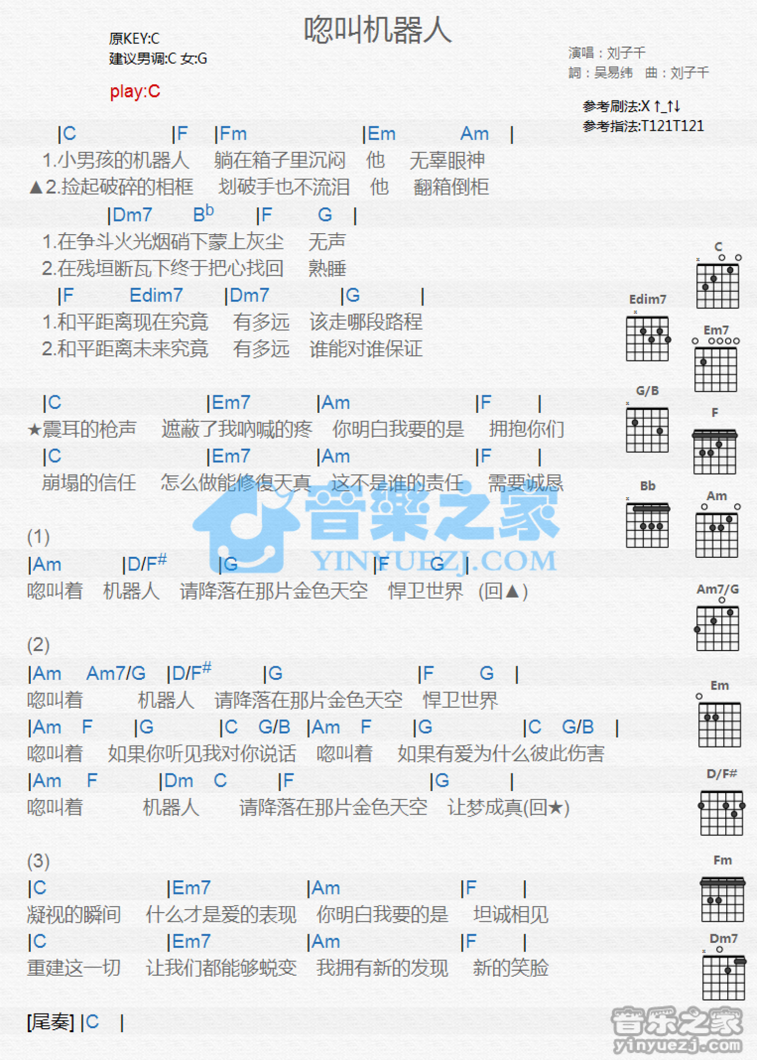 曲谱介绍: C调版 刘子千《呼叫机器人》吉他和弦弹唱谱