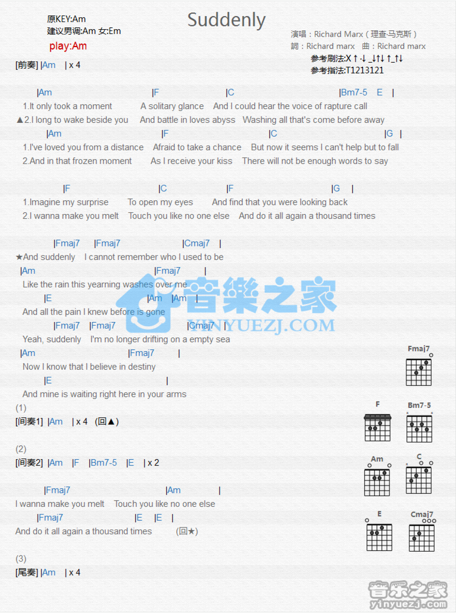 曲谱介绍: Am调版 Richard Marx《Suddenly》吉他和弦弹唱谱