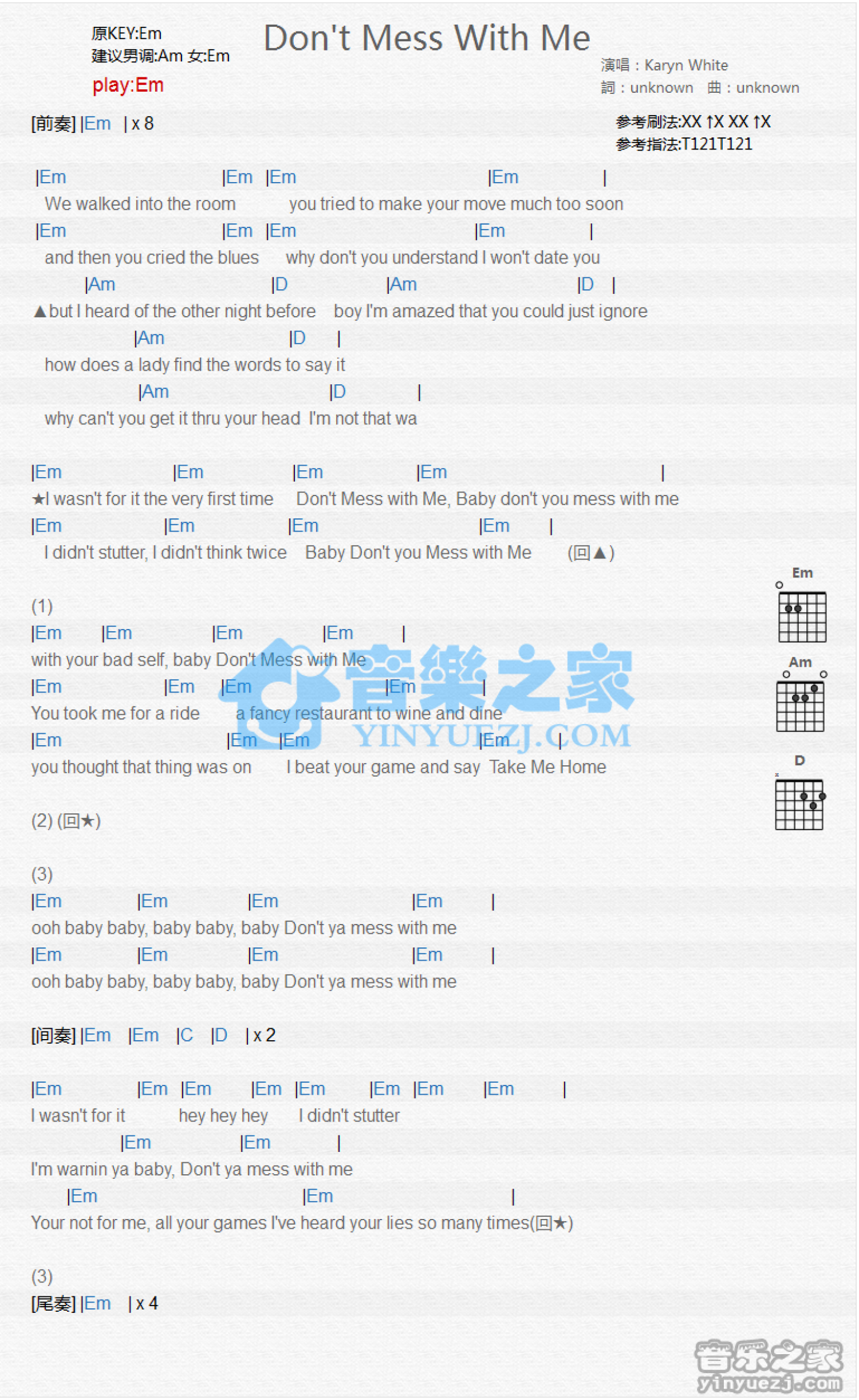 曲谱介绍: Em调版 Karyn White《Don't Mess With Me》吉他和弦弹唱谱