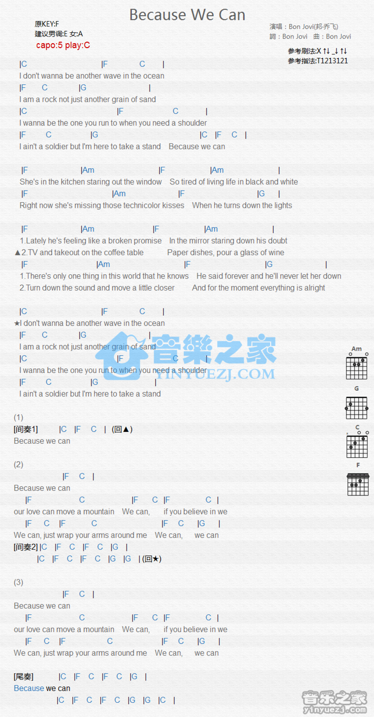 曲谱介绍: C调版 Bon Jovi《Because We Can》吉他和弦弹唱谱