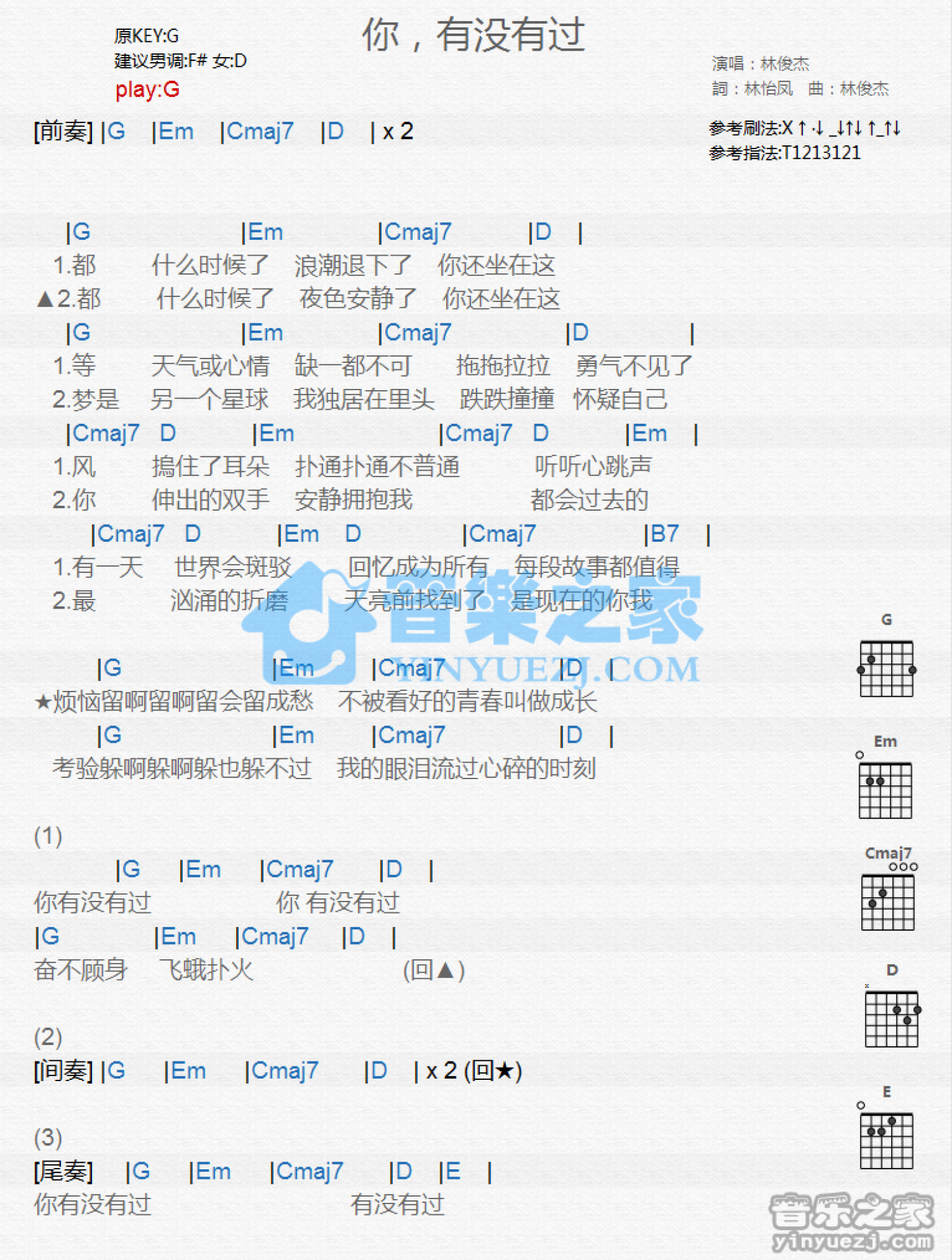 曲谱介绍: G调版 林俊杰《你有没有过》吉他和弦弹唱谱
