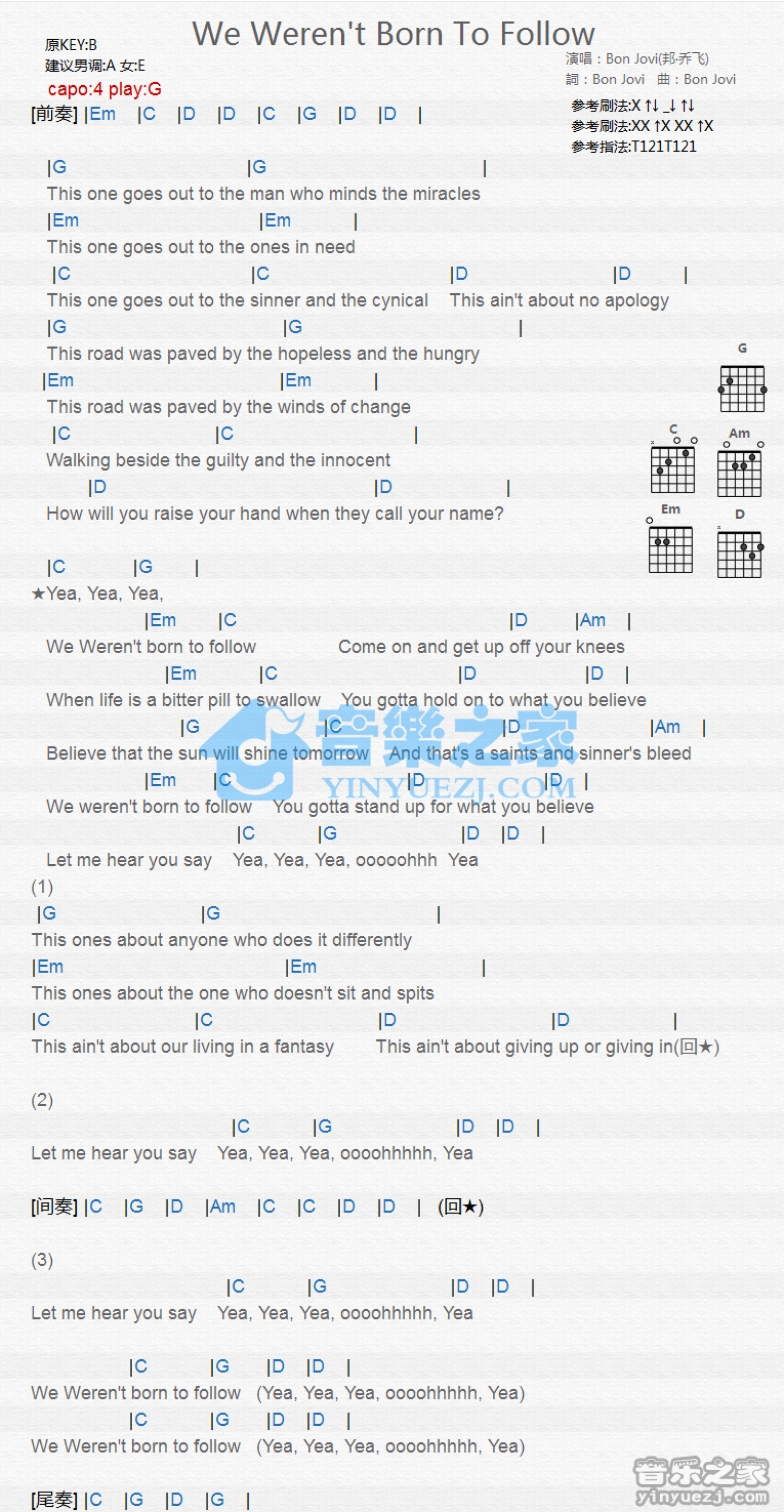 曲谱介绍: G调版 Bon Jovi《We Weren't Born to Follow》吉他和弦弹唱谱