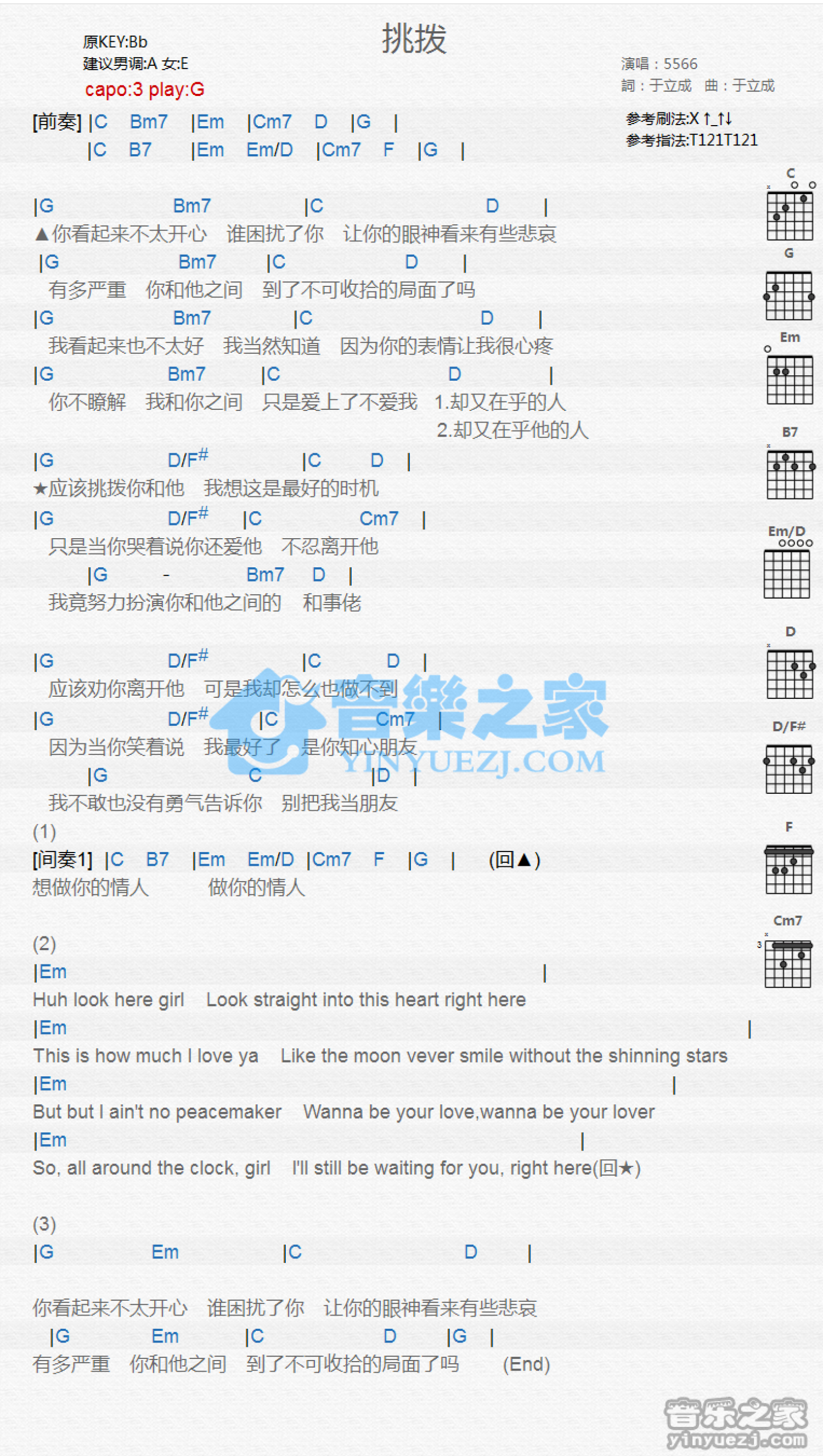 曲谱介绍: G调版 5566《挑拨》吉他和弦弹唱谱