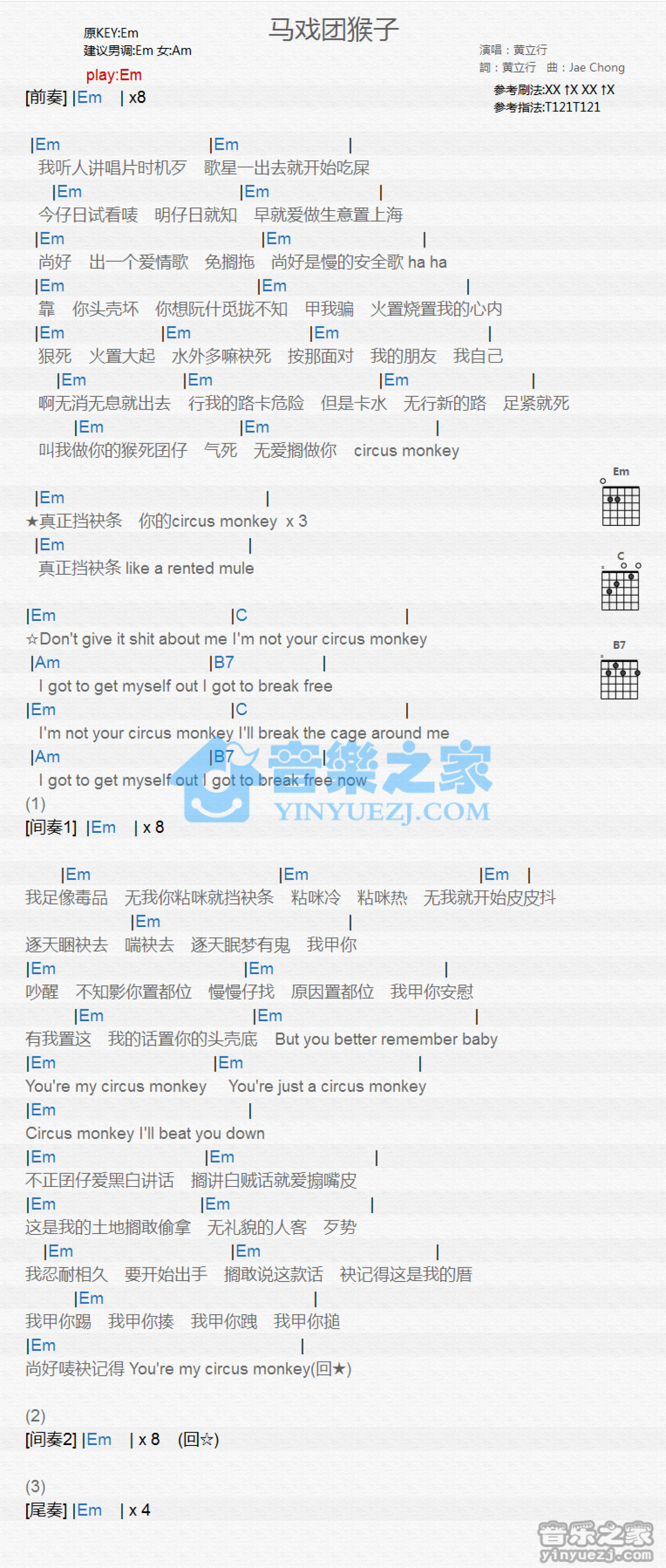 曲谱介绍: Em调版 黄立行《马戏团猴子》吉他和弦弹唱谱