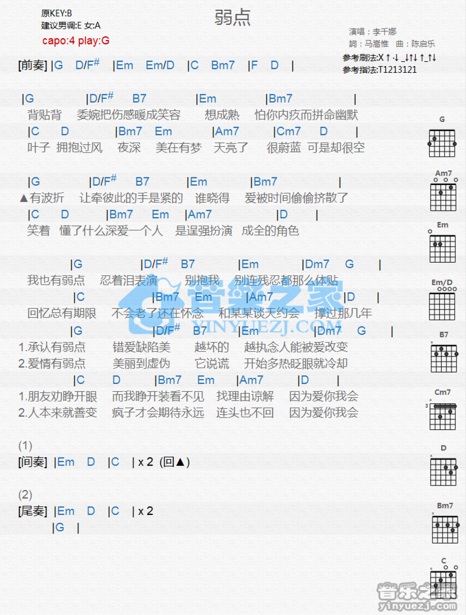 曲谱介绍: G调版 李千娜《弱点》吉他和弦弹唱谱