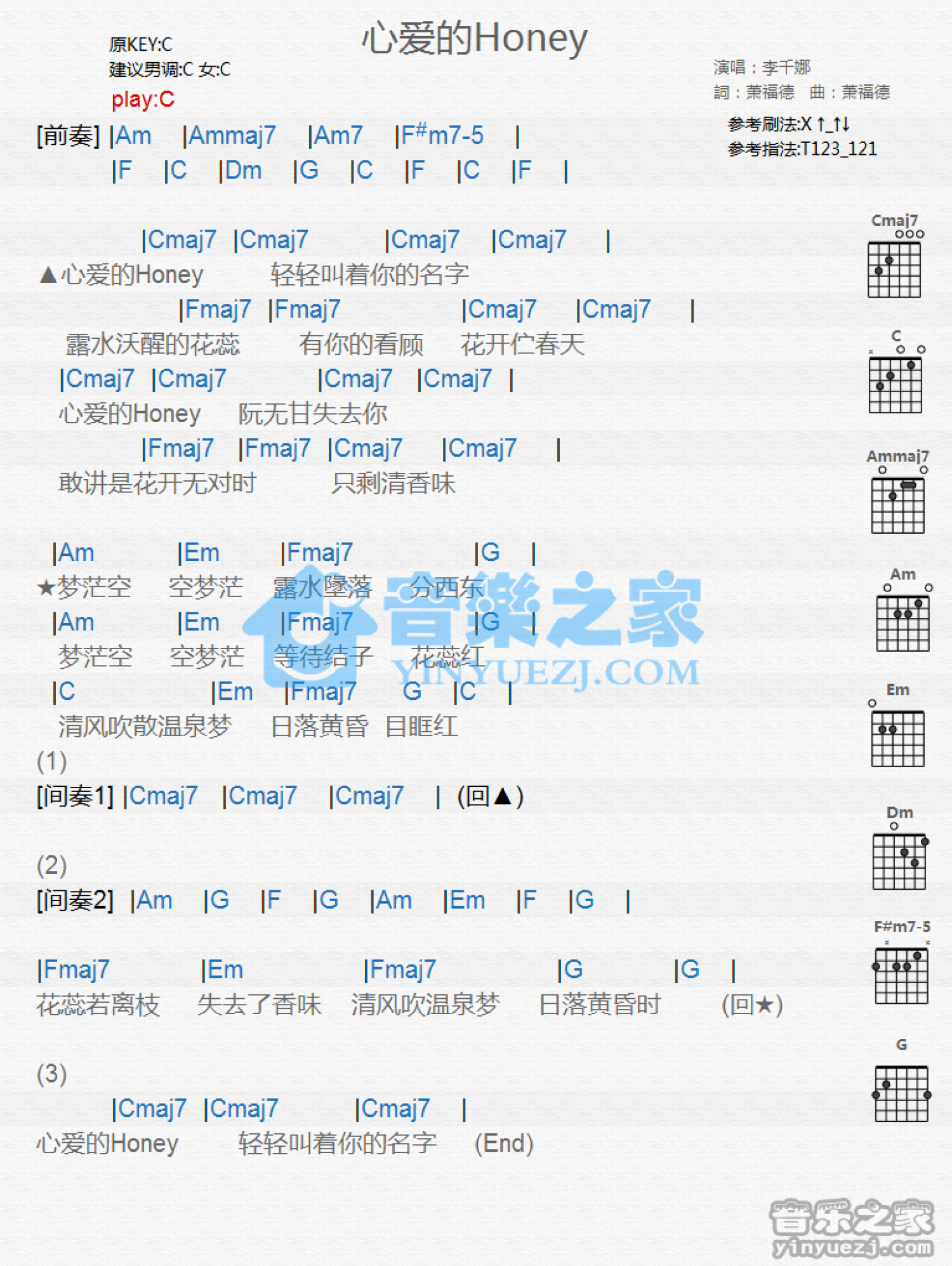 曲谱介绍: C调版 李千娜《心爱的Honey》吉他和弦弹唱谱