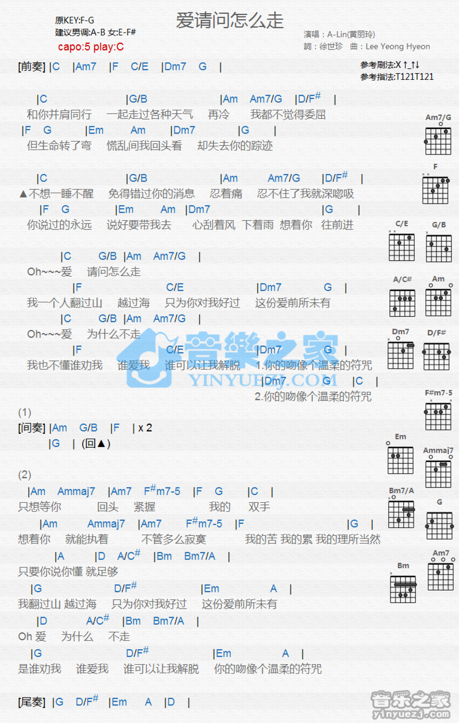曲谱介绍: C调版 A-Lin《爱请问怎么走》吉他和弦弹唱谱