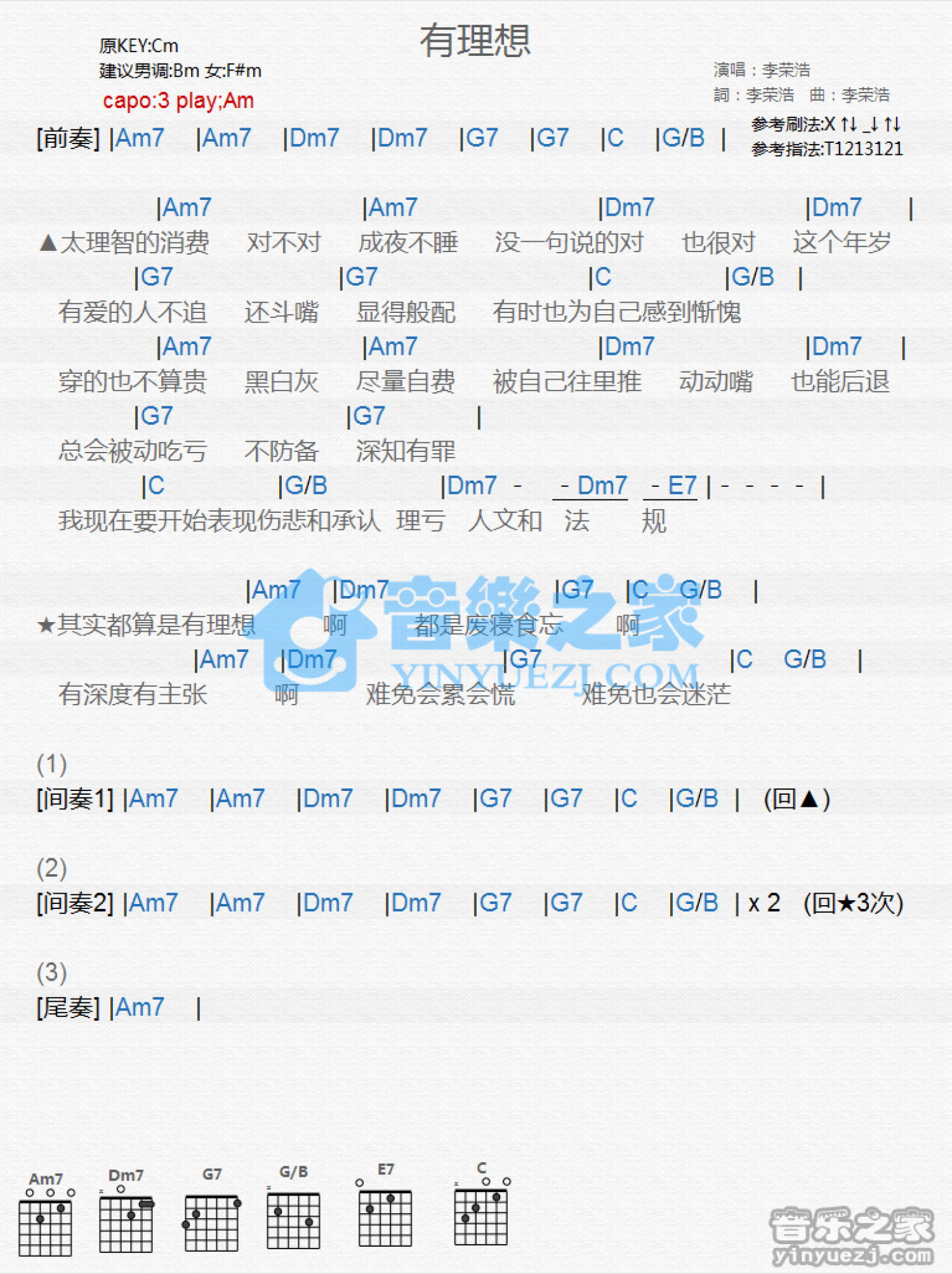 曲谱介绍: Am调版 李荣浩《有理想》吉他和弦弹唱谱
