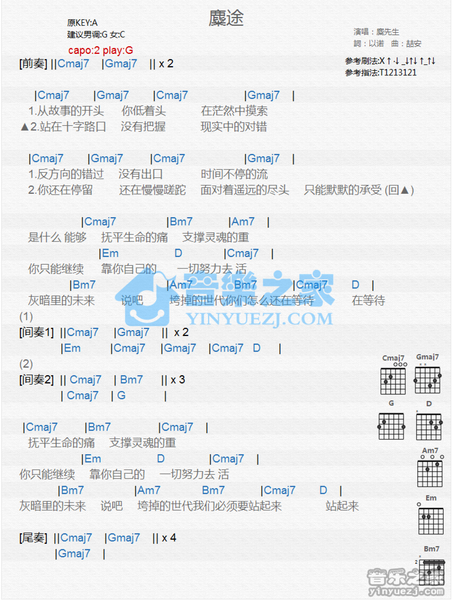 曲谱介绍: G调版《麋途》吉他和弦弹唱谱