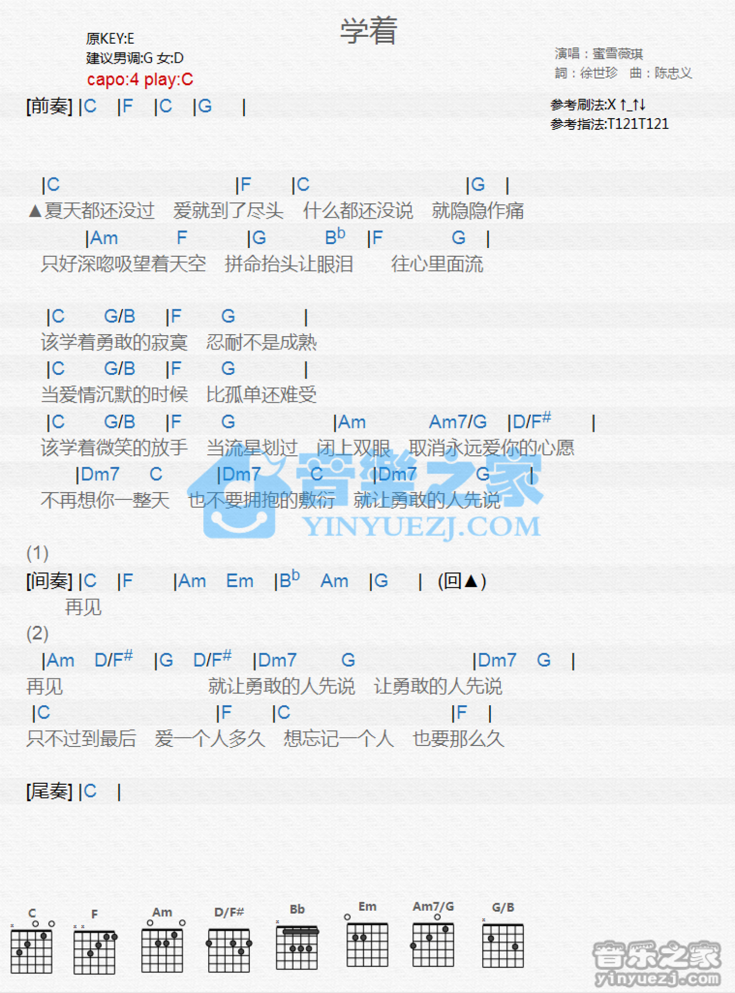 曲谱介绍: C调版 蜜雪薇琪《学着》吉他和弦弹唱谱