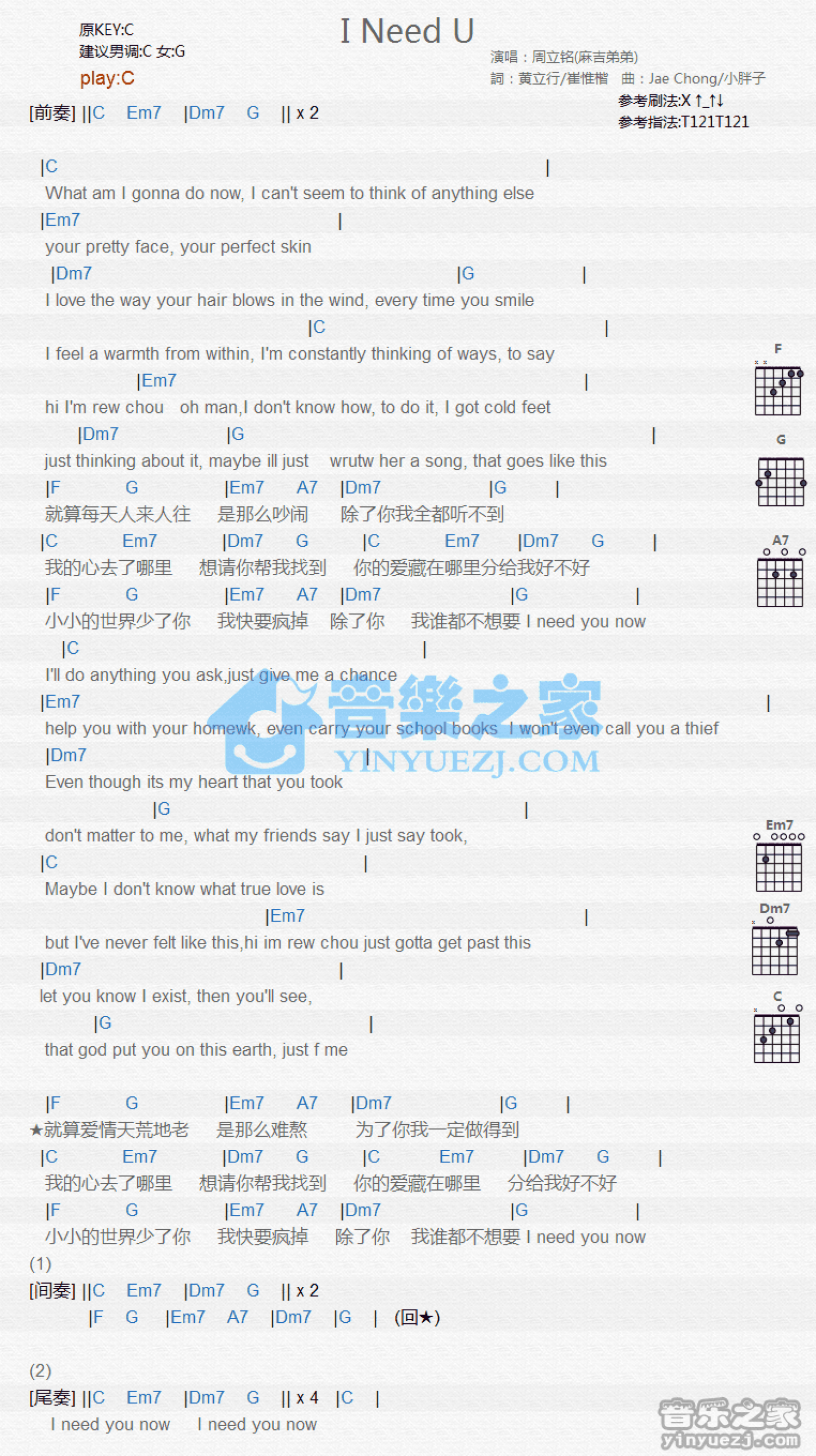 曲谱介绍: C调版 周立铭《I Need U》吉他和弦弹唱谱
