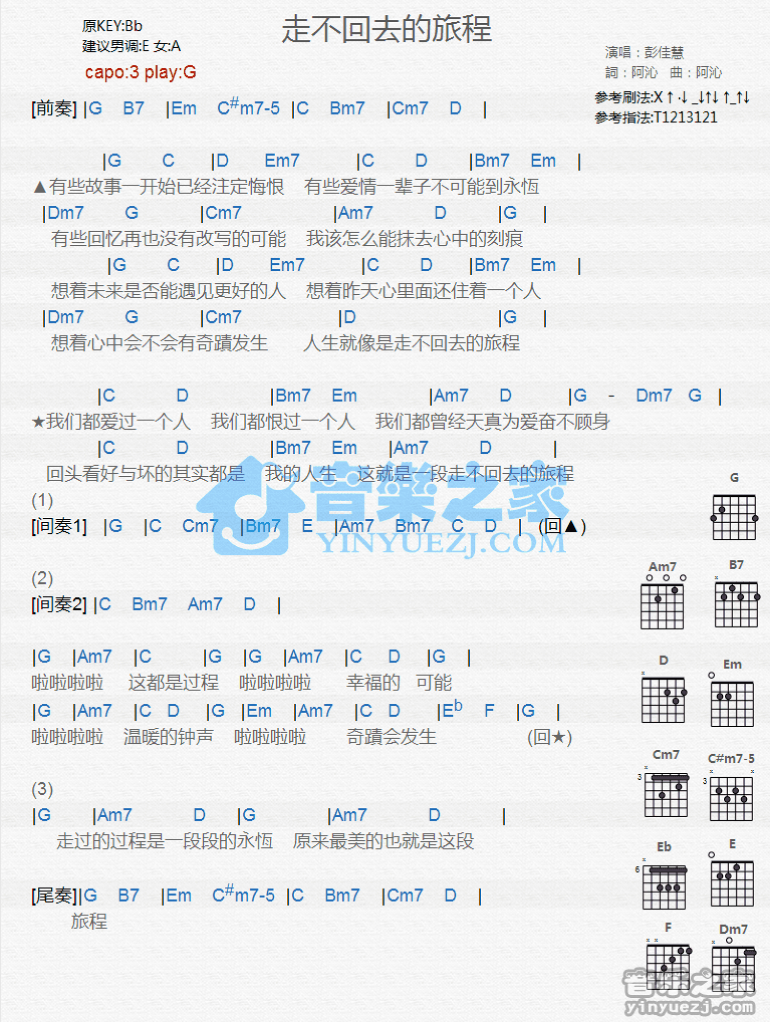 曲谱介绍: G调版 彭佳慧《走不回去的旅程》吉他和弦弹唱谱