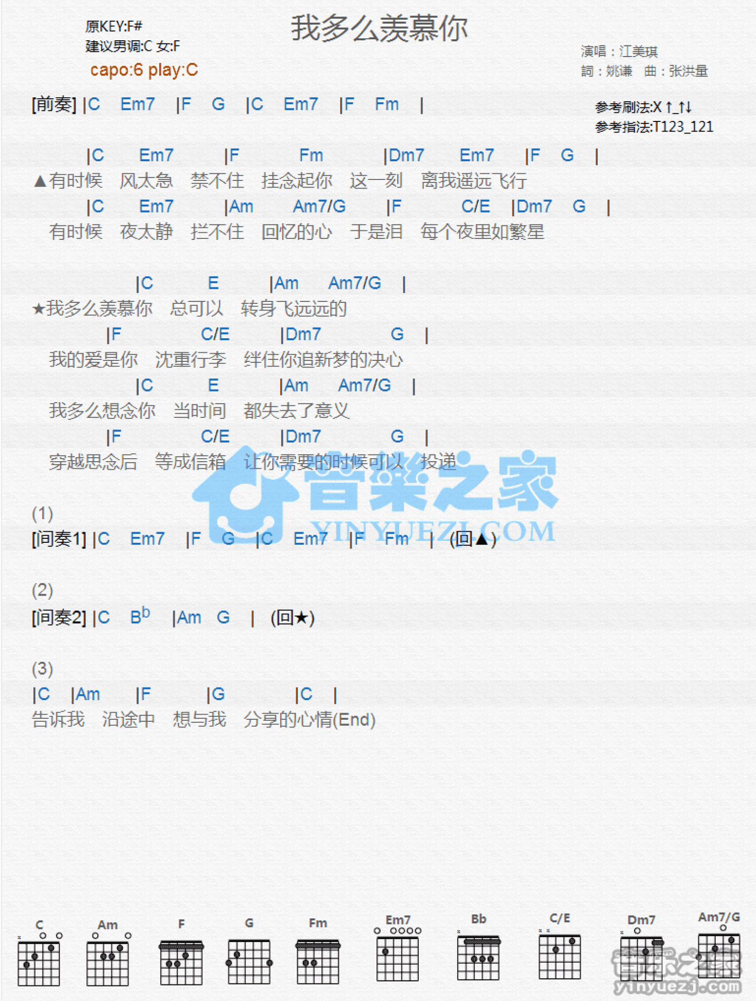 曲谱介绍: C调版 江美琪《我多么羡慕你》吉他和弦弹唱谱