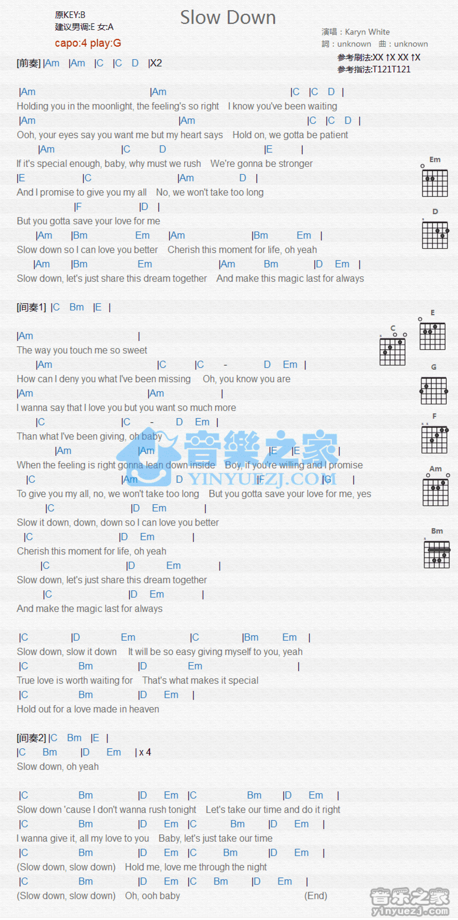 曲谱介绍: G调版 Karyn White《Slow Down》吉他和弦弹唱谱