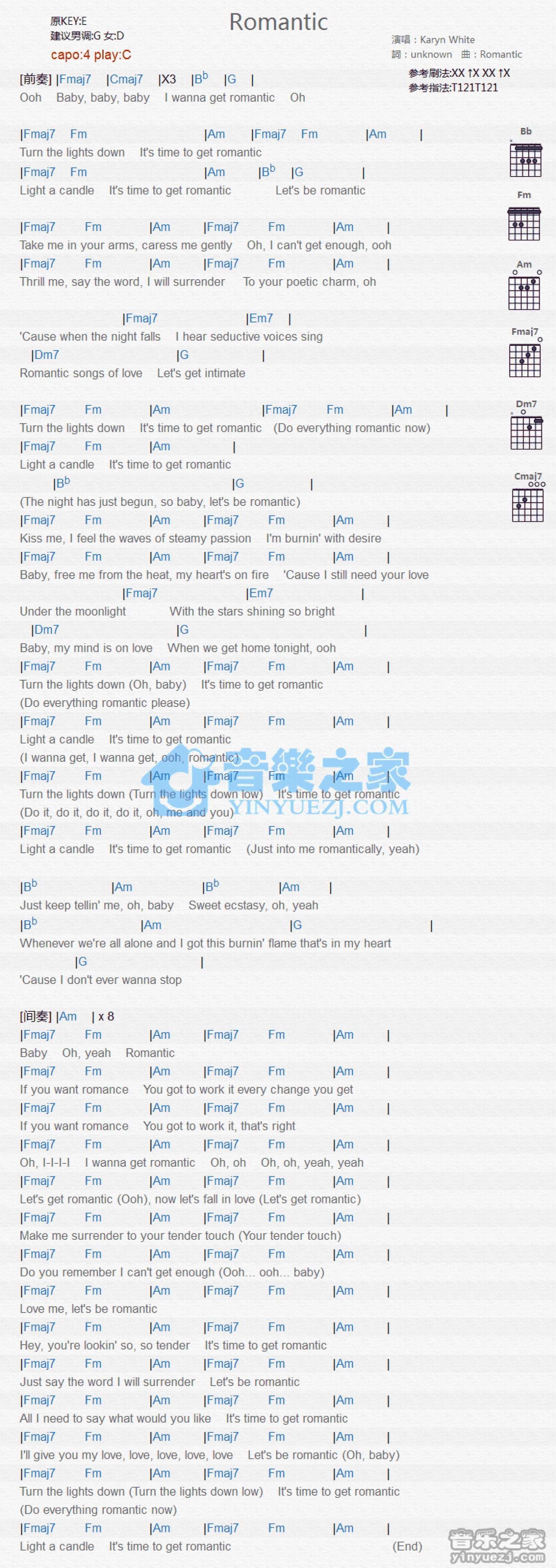 曲谱介绍: C调版 Karyn White《Romantic》吉他和弦弹唱谱