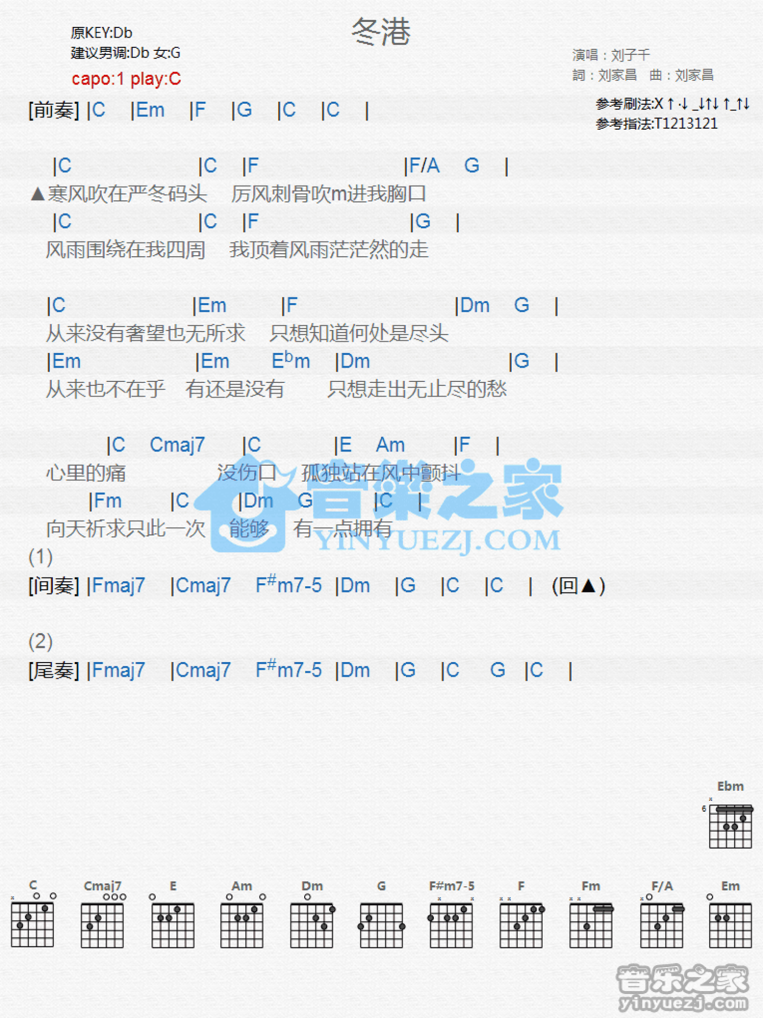 曲谱介绍: C调版 刘子千《冬港》吉他和弦弹唱谱