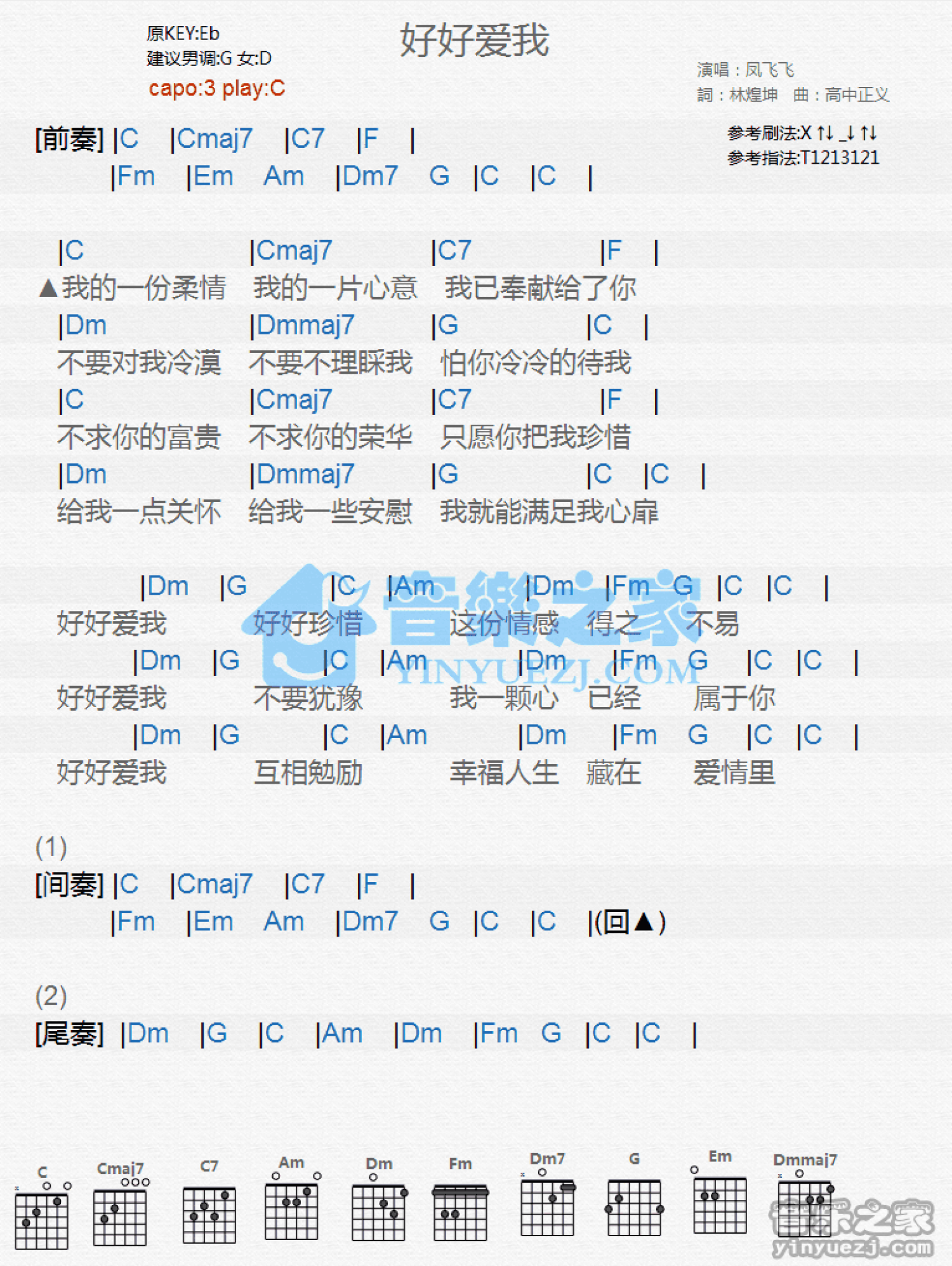 曲谱介绍: C调版《好好爱我》吉他和弦弹唱谱