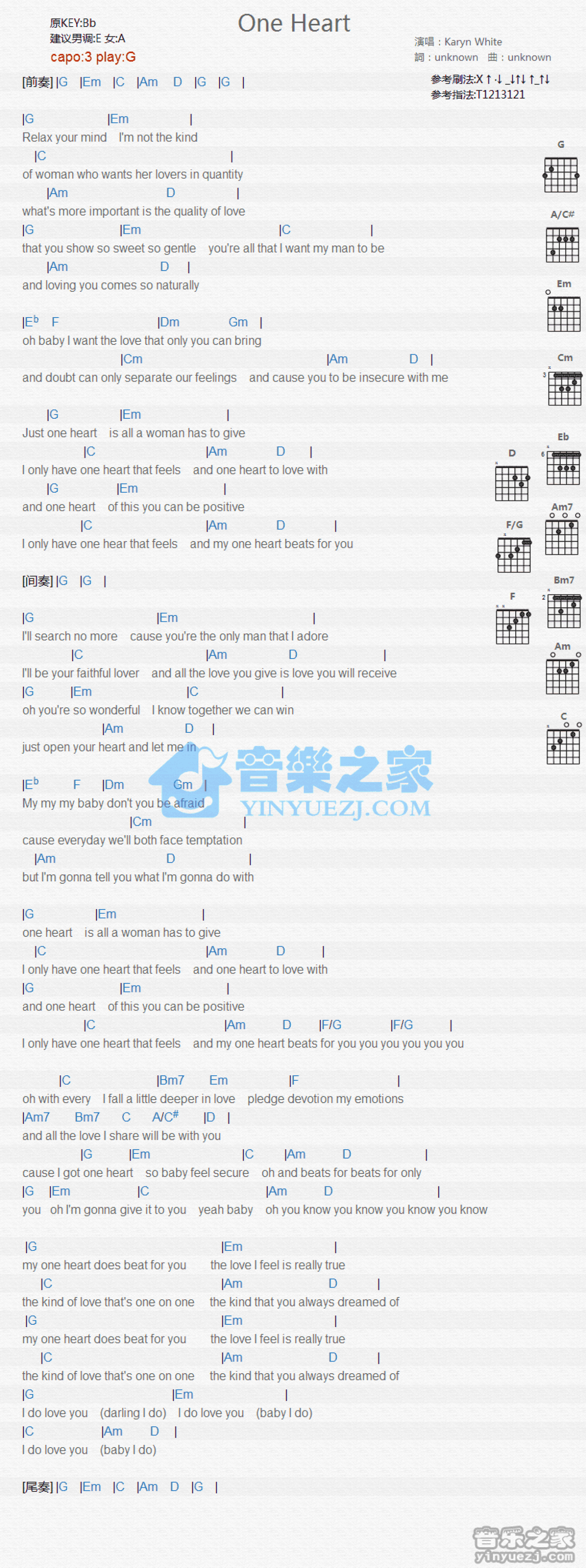 曲谱介绍: G调版 Karyn White《One Heart》吉他和弦弹唱谱