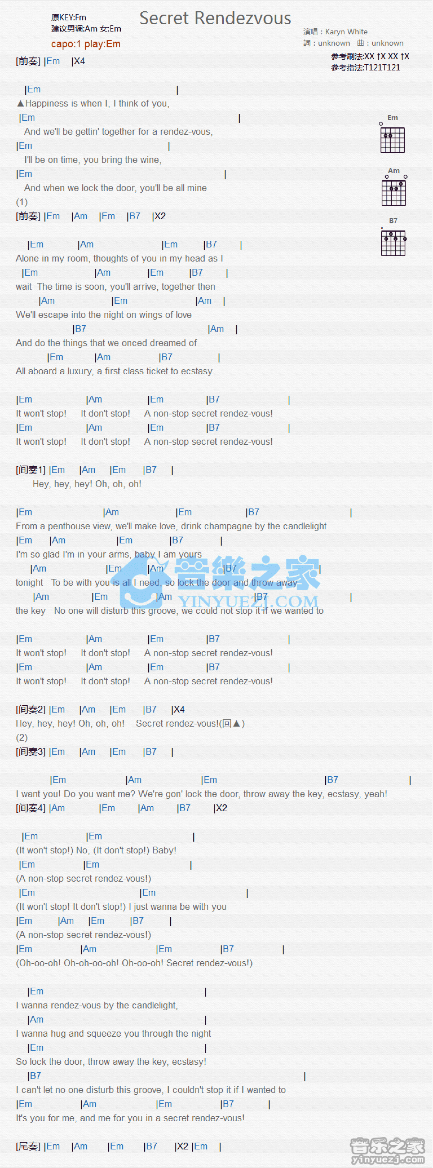 曲谱介绍: Em调版 Karyn White《Secret Rendezvous》吉他和弦弹唱谱
