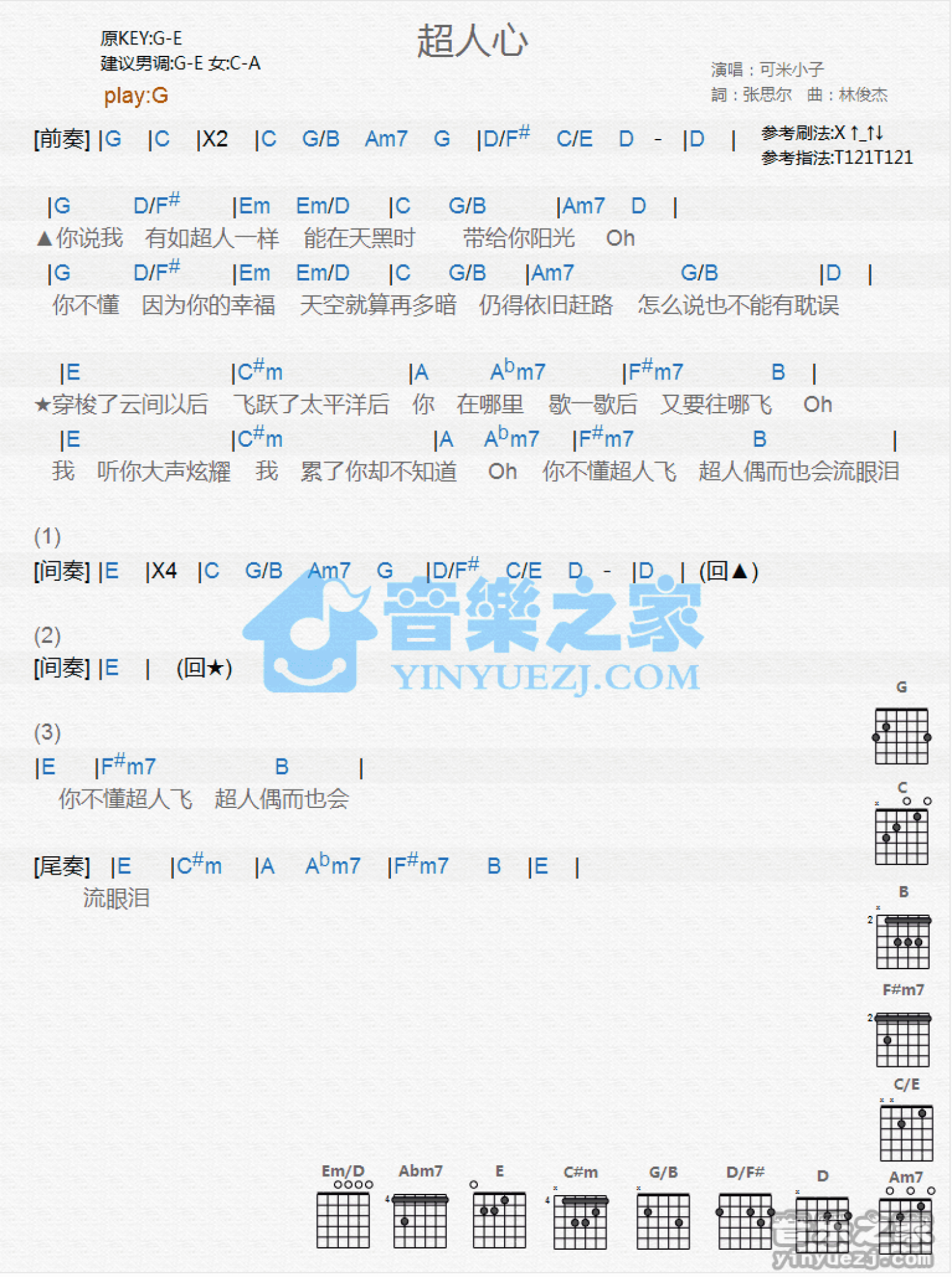 曲谱介绍: G调版 可米小子《超人心》吉他和弦弹唱谱