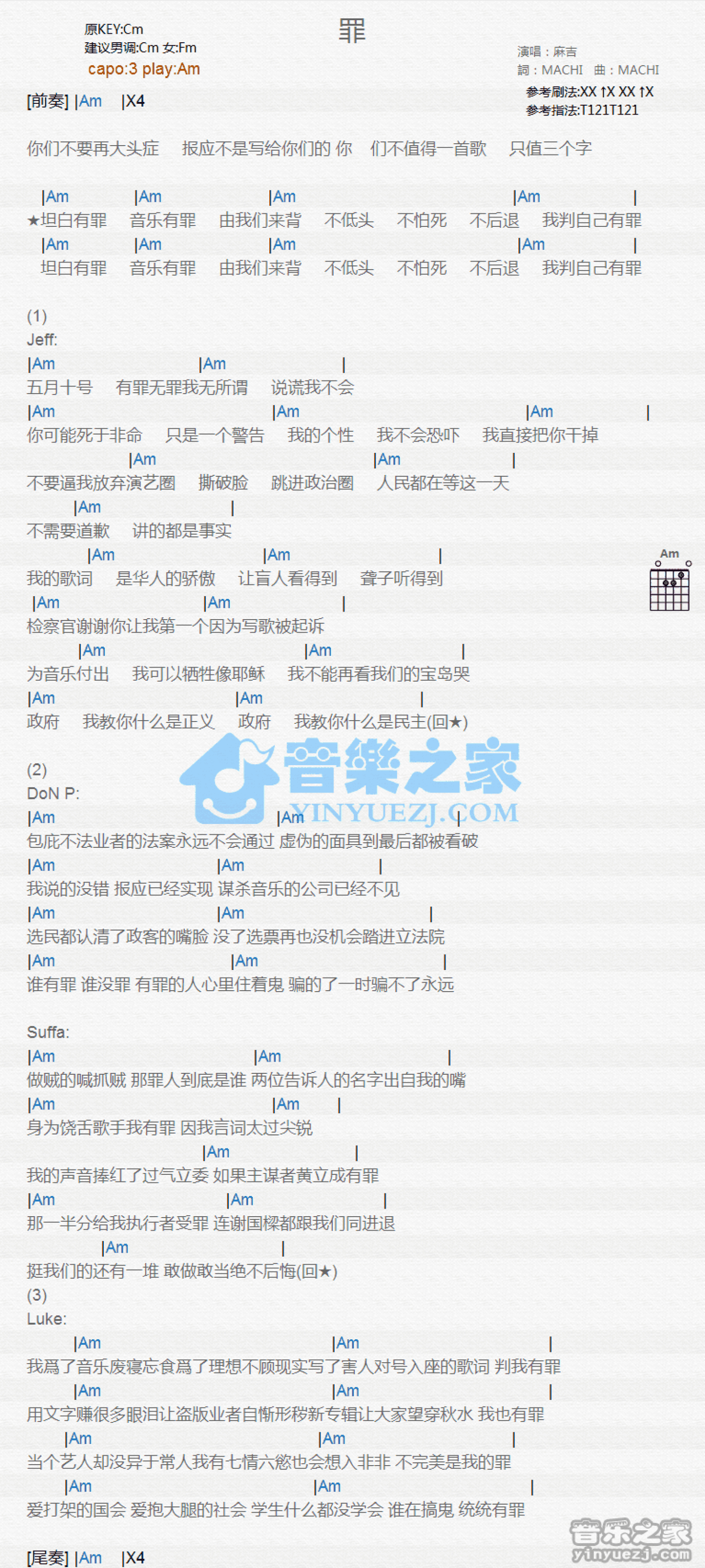 曲谱介绍: Am调版 麻吉《罪》吉他和弦弹唱谱