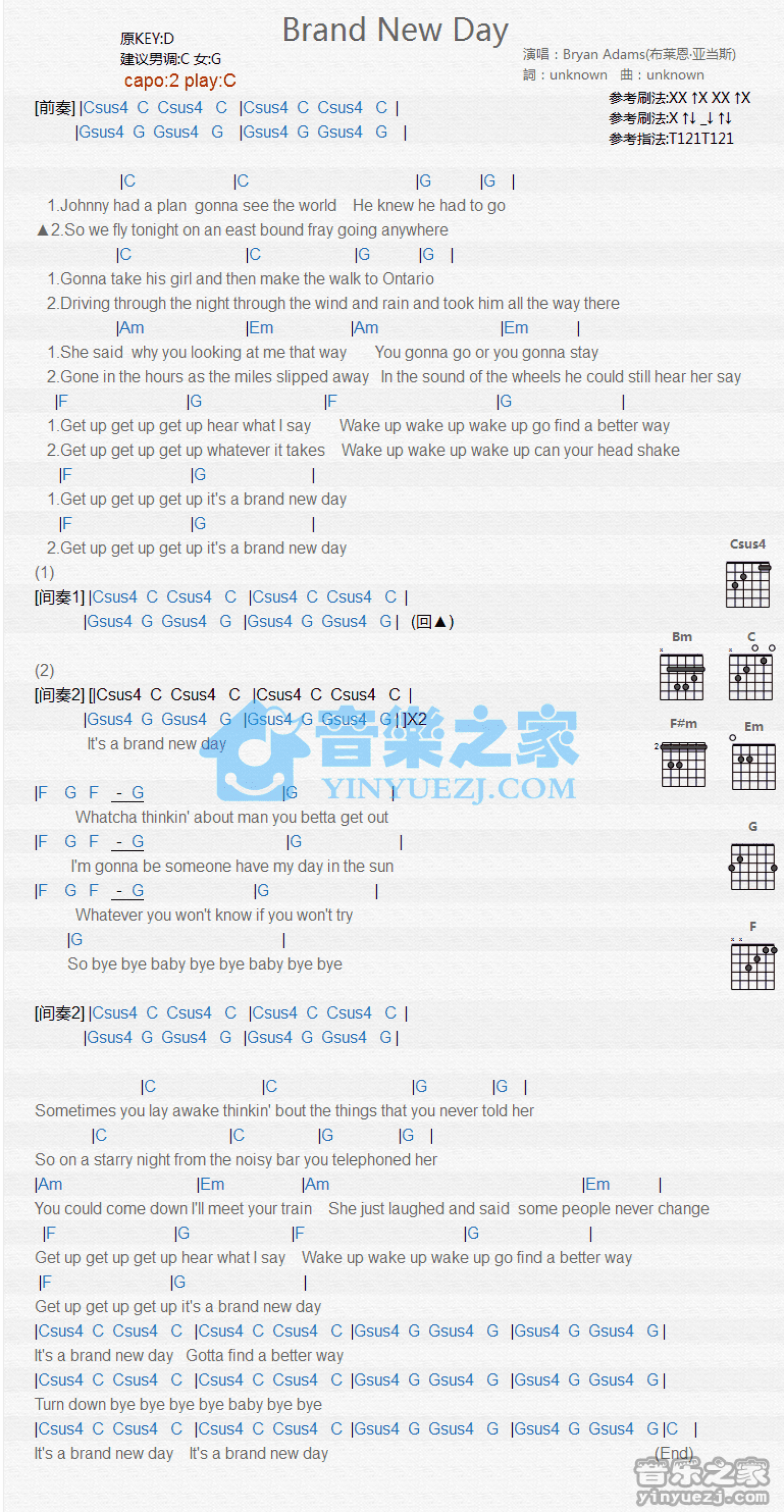 曲谱介绍: C调版 Bryan Adams《Brand New Day》吉他和弦弹唱谱