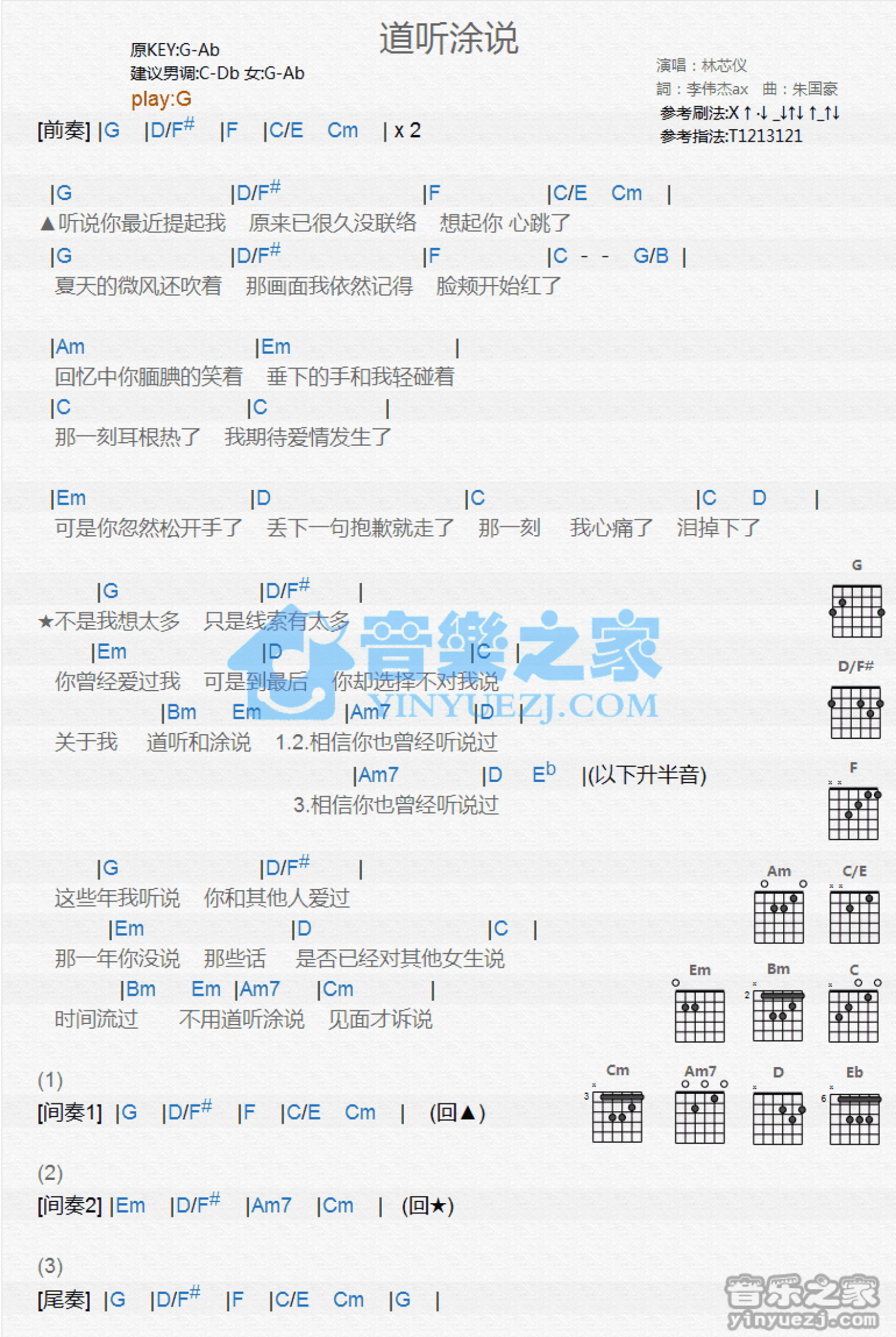 曲谱介绍: G调版 林芯仪《道听途说》吉他和弦弹唱谱