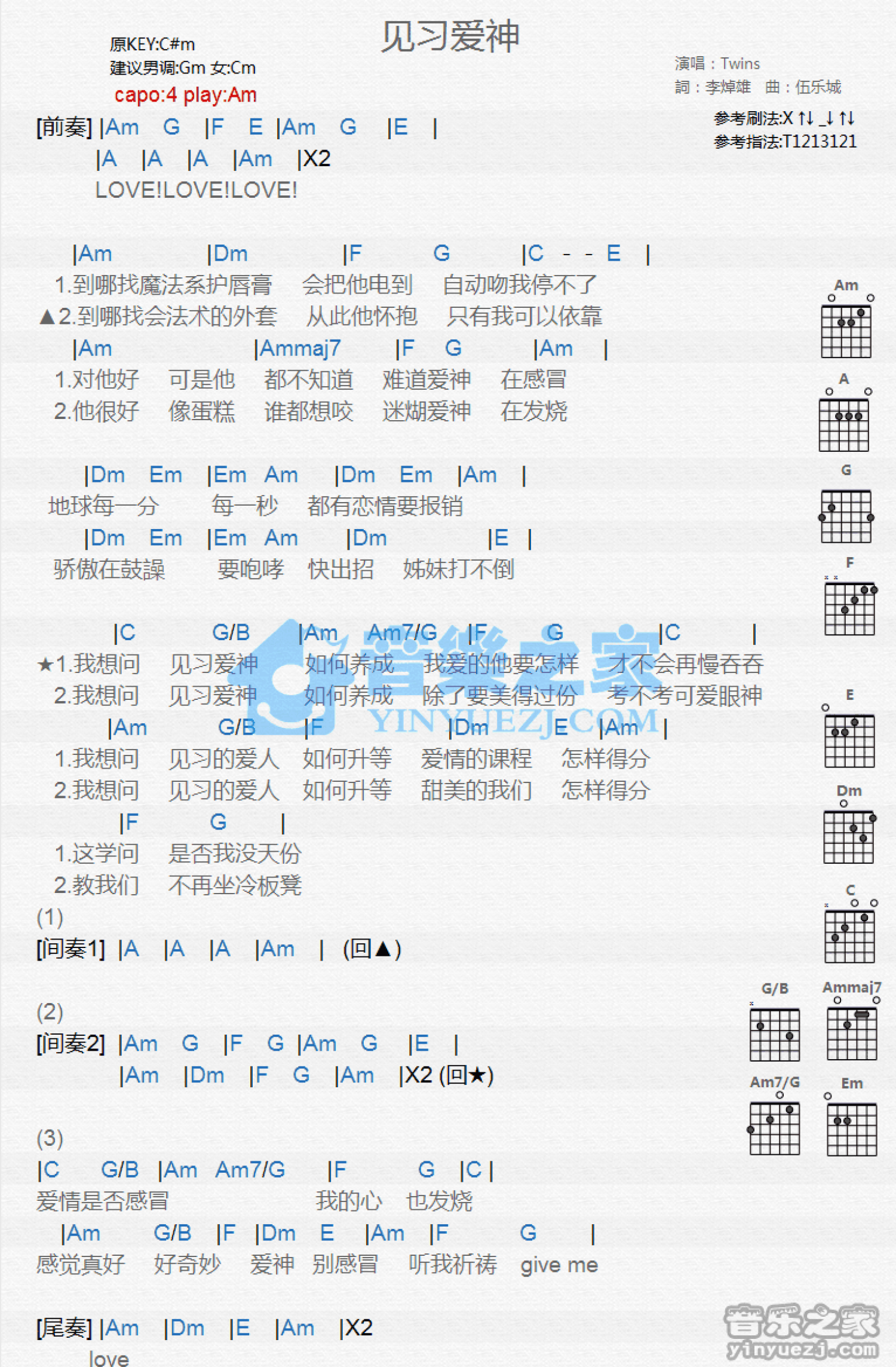 曲谱介绍: Am调版Twins《见习爱神》吉他和弦弹唱谱