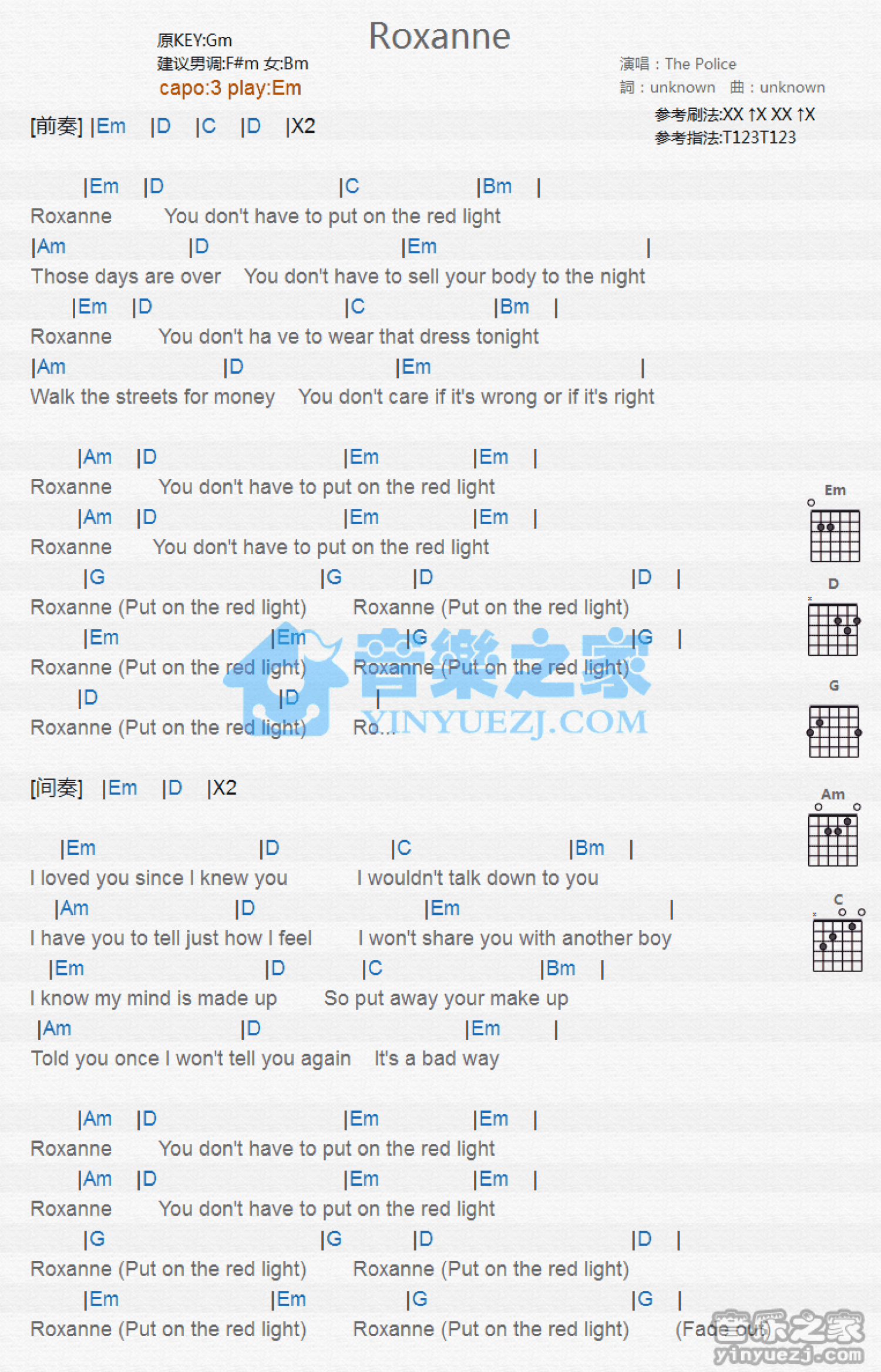 曲谱介绍: Em调版 The Police《Roxanne》吉他和弦弹唱谱